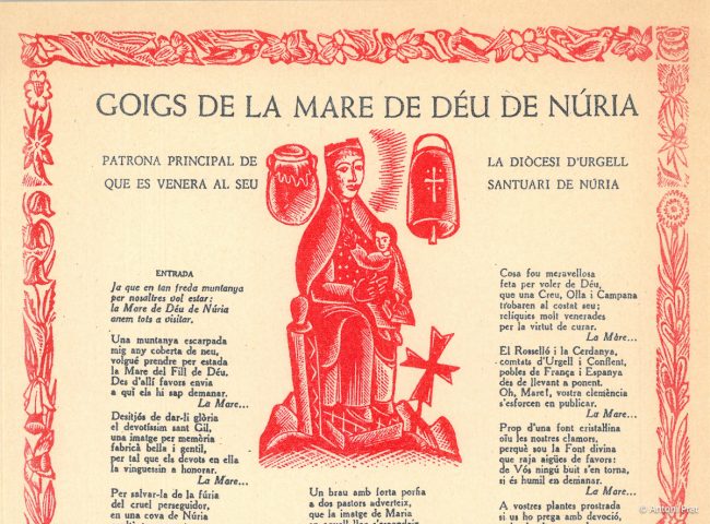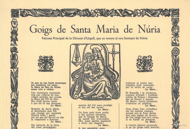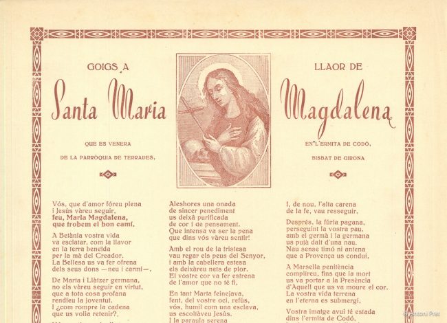 TÍTOL: GOIGS A LLAOR DE SANTA MARIA MAGDALENA QUE ES VENERA EN L’ERMITA DE CODÓ, DE LA PARRÒQUIA DE TERRADES, BISBAT DE GIRONA ADVOCACIÓ: Santa Maria Magdalena PARRÒQUIA / CAPELLA: ermita de Santa Magdalena (antigament Santa Maria de Codó), a Terrades AUTOR LLETRA: Montserrat Vayreda Trullol AUTOR MÚSICA: no consta AUTOR DIBUIXOS: no consta IMPREMTA:…