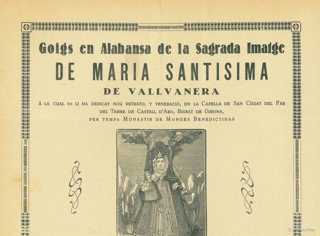 TÍTOL: GOIGS EN ALABANSA DE LA SAGRADA IMATGE DE MARIA SANTISIMA DE VALLVANERA, Á LA CUAL SE LI HA DEDICAT NOU RETRATO, Y VENERACIÓ, EN LA CAPELLA DE SANT CUGAT DEL FAR DEL TERME DE CASTELL D’ARO, BISBAT DE GIRONA, PER TEMPS MONASTIR DE MONGES BENEDICTINES ADVOCACIÓ: Mare de Déu de Vallvanera PARRÒQUIA / CAPELLA:…