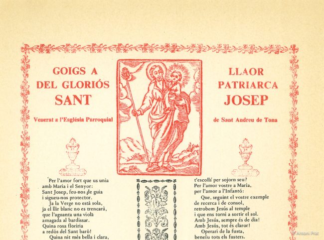 TÍTOL: GOIGS A LLAOR DEL GLORIÓS PATRIARCA SANT JOSEP VENERAT A L’ESGLÉSIA PARROQUIAL DE SANT ANDREU DE TONA ADVOCACIÓ: Sant Andreu PARRÒQUIA / CAPELLA: església parroquial de Sant Andreu, a Tona AUTOR LLETRA: Joan Colom AUTOR MÚSICA: no consta AUTOR DIBUIXOS: no consta IMPREMTA: no consta EDITOR: no consta ANY: 1973 OBSERVACIONS: MIDES: 31,5…