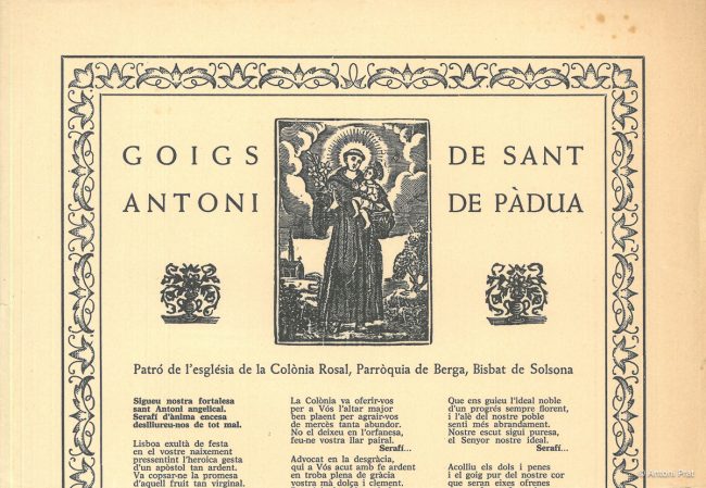 TÍTOL: GOIGS DE LA GLORIOSA VERGE I MARTIR SANTA AGNÉS PATRONA DE LA IGLESIA PARROQUIAL DE SOLIUS BISBAT DE GIRONA ADVOCACIÓ: Santa Agnès PARRÒQUIA / CAPELLA: església parroquial de Santa Agnès, a Solius, entitat de població de Santa Cristina d’Aro AUTOR LLETRA: no consta AUTOR MÚSICA: Lluis Romeu (cap d’any de 1925) AUTOR DIBUIXOS: no…