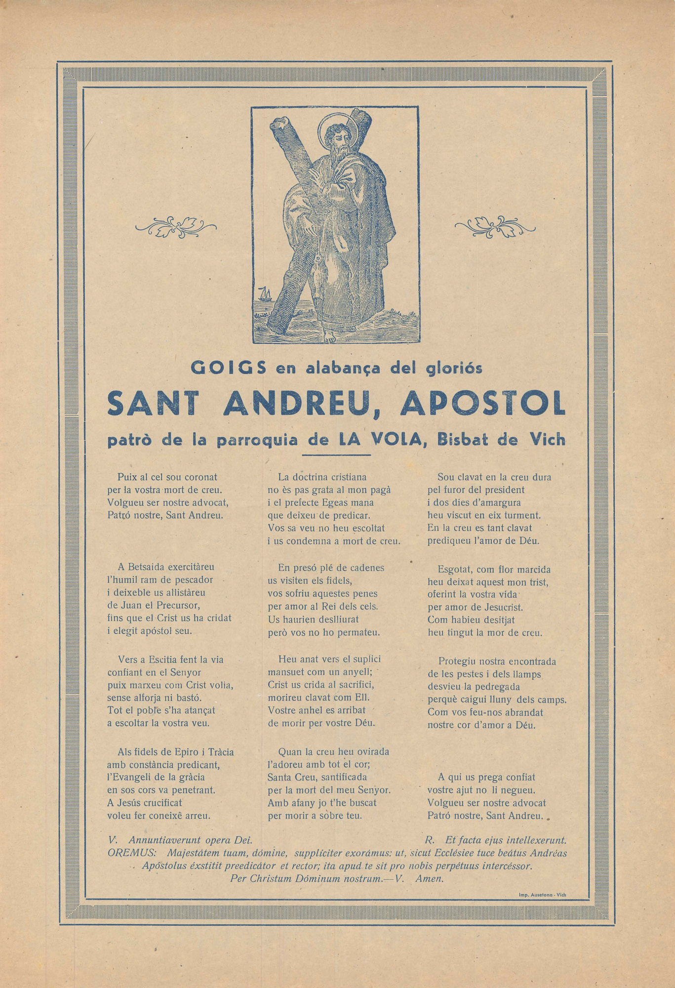 GOIGS EN ALABANÇA DEL GLORIÓS SANT ANDREU, APOSTOL, PATRÓ DE LA PARROQUIA DE LA VOLA, BISBAT DE VICH