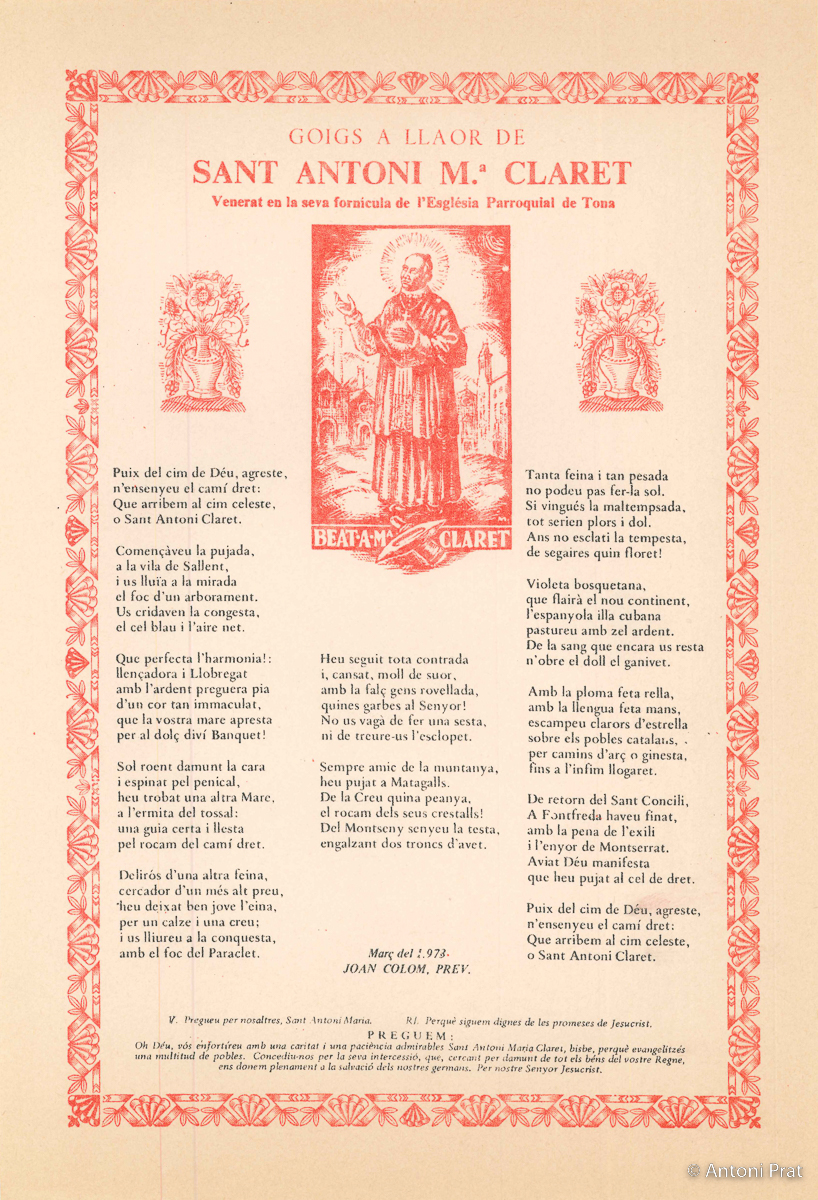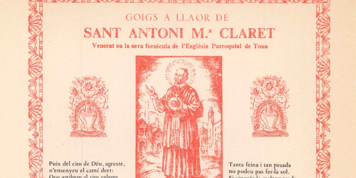 GOIGS A LLAOR DE SANT ANTONI M.ª CLARET, VENERAT EN LA SEVA FORNÍCULA DE L’ESGLÉSIA PARROQUIAL DE TONA