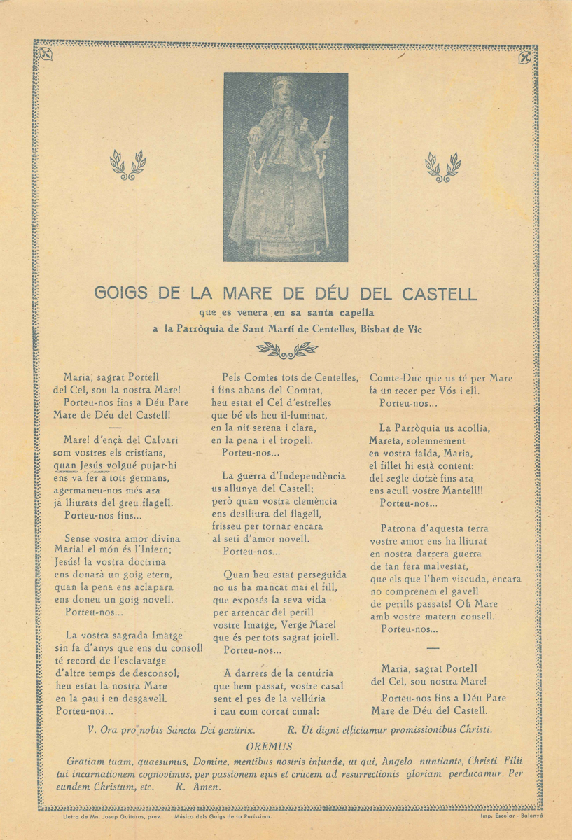 GOIGS DE LA MARE DE DÉU DEL CASTELL, QUE ES VENERA EN SA SANTA CAPELLA, A LA PARRÒQUIA DE SANT MARTÍ DE CENTELLES, BISBAT DE VIC