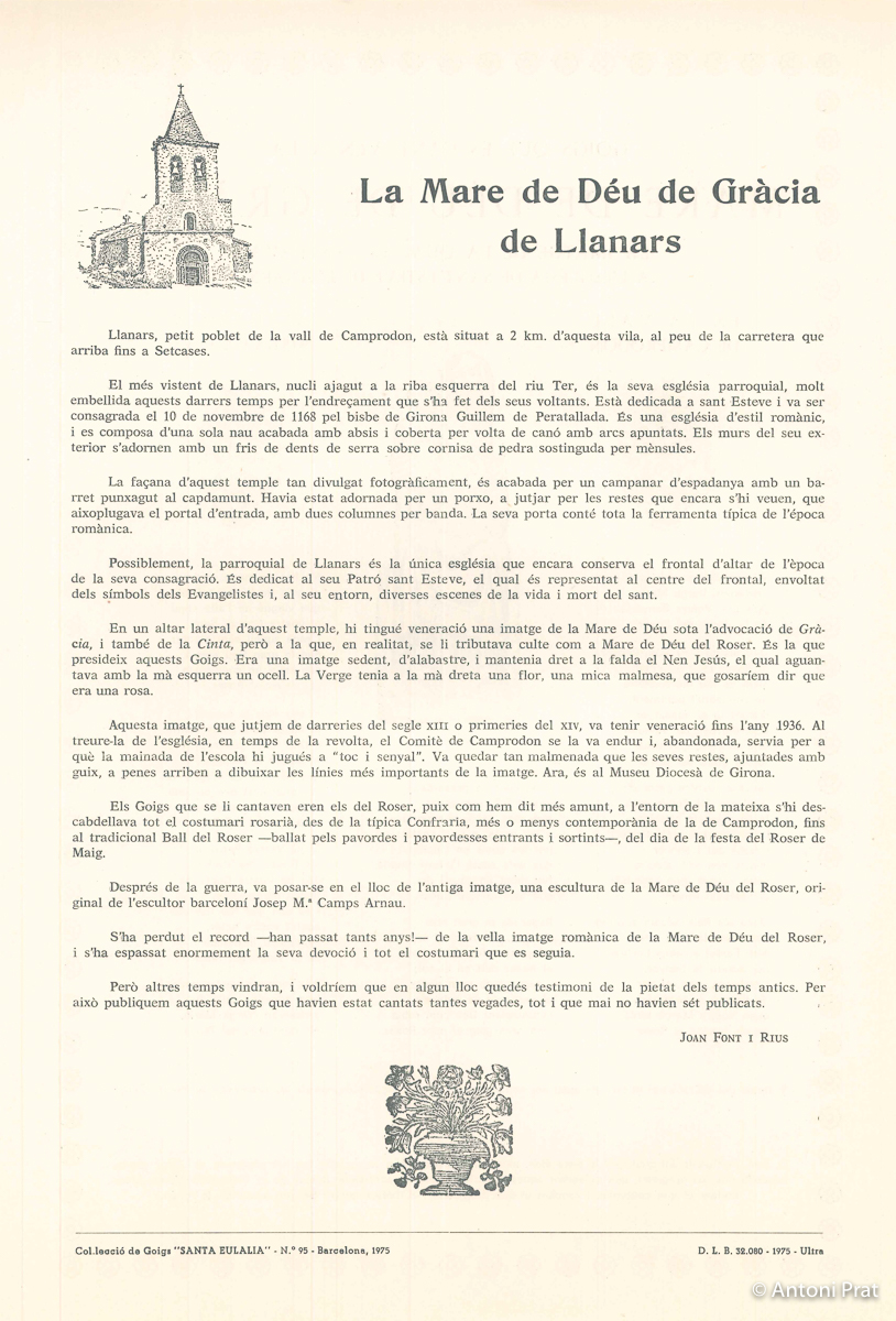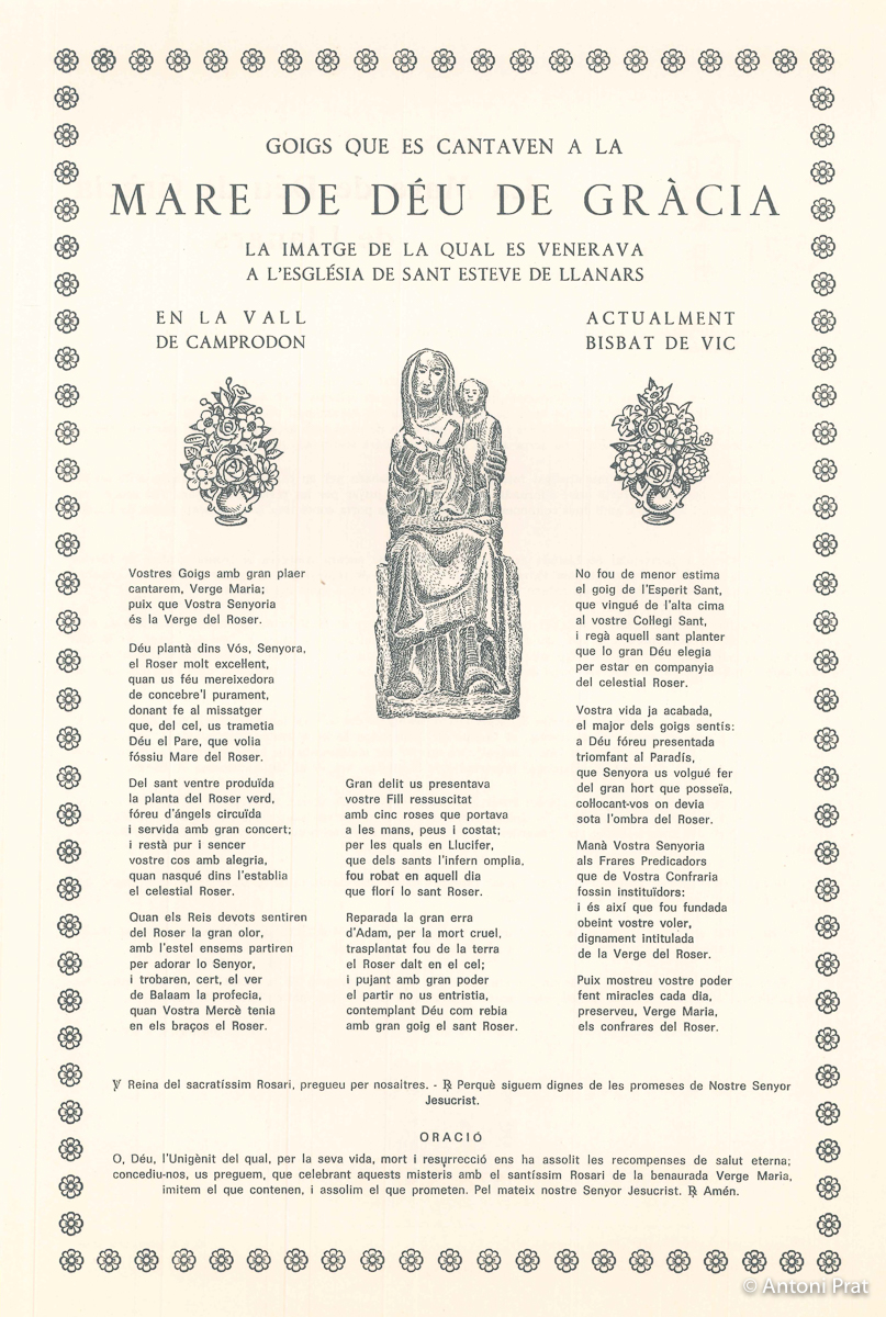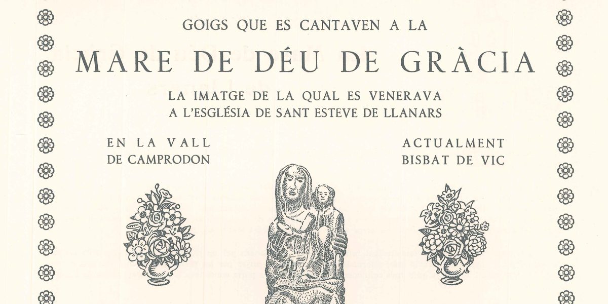 GOIGS QUE ES CANTAVEN A LA MARE DE DÉU DE GRÀCIA, LA IMATGE DE LA QUAL ES VENERAVA A L’ESGLÉSIA DE SANT ESTEVE DE LLANARS, EN LA VALL DE CAMPRODON, ACTUALMENT BISBAT DE VIC