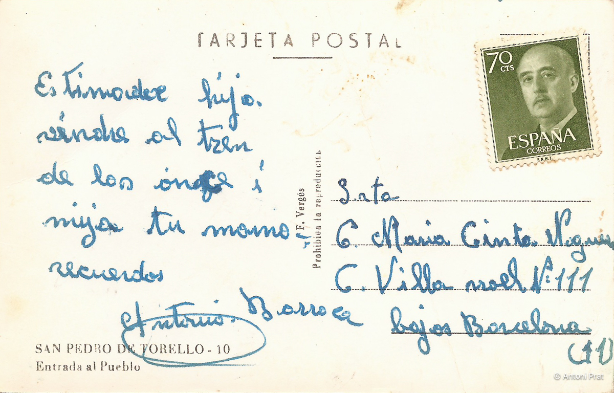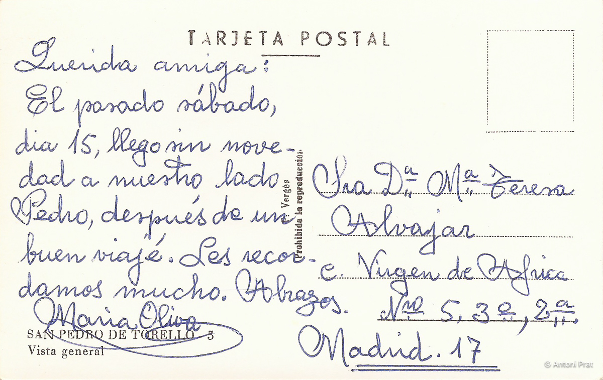 Col·lecció de postals numerades de Sant Pere de Torelló i rodalies. En aquest cas molt curiosa pels colors de les seves vistes. Es veu clarament com es tracta d’imatges en blanc i negre on s’hi ha afegit un tractament de color. Les mateixes imatges en blanc i negre es poden veure en una altra col·lecció.