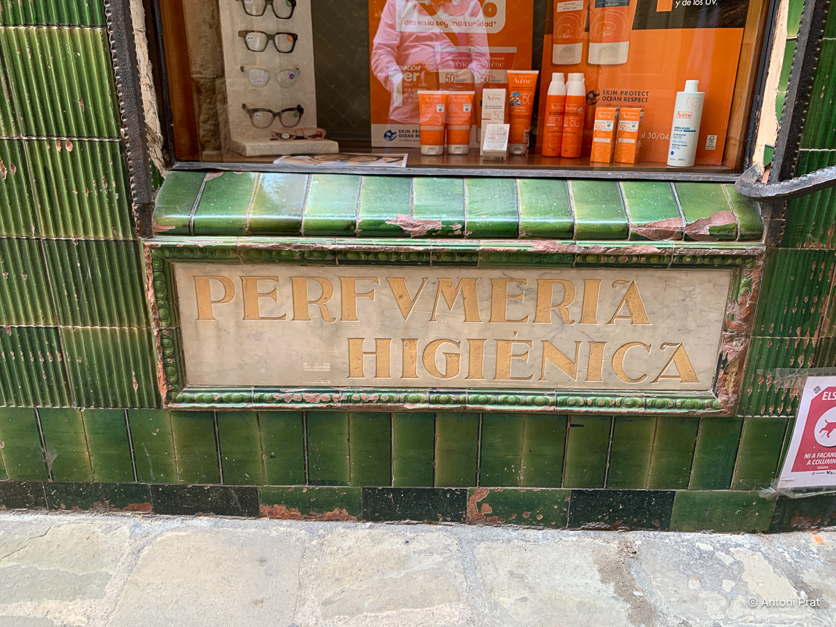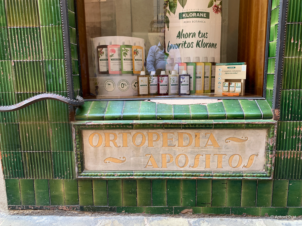 Sota els dos aparadors va situar-hi dos cartells esgrafiats amb tipografia anunciant els serveis ortopèdics i apòsits. Les lletres són daurades, de disseny singular i amb el fons de ceràmica blanca.