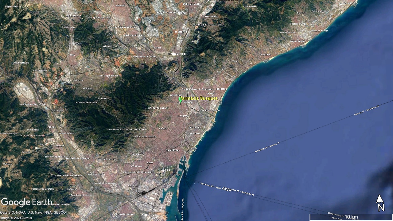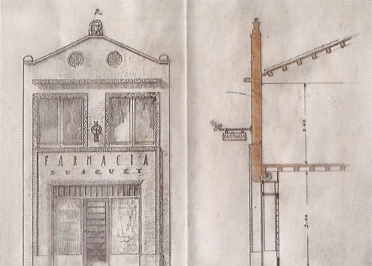 Pericas havia treballat l’any 1917 en obres de la clínica mental de Santa Coloma que dirigia el Dr. Tomàs Busquet i Teixidor, avi de Carles Busquet Masip propietari de la farmàcia al barri de Sant Andreu. Amb aquest precedent, quan es renovà la farmàcia se li demanà una actuació en la façana que abastava la porta de l’establiment i les dues finestres de l’habitatge del primer pis.