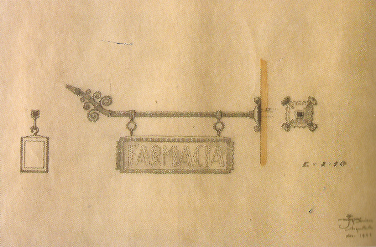 El conjunt es completava amb un cartell de ferro forjat, del que avui només queda el suport del cartell que sobresurt de la façana. Avui l’edifici és més baix i no conserva la part alta sobre les finestres del projecte inicial.