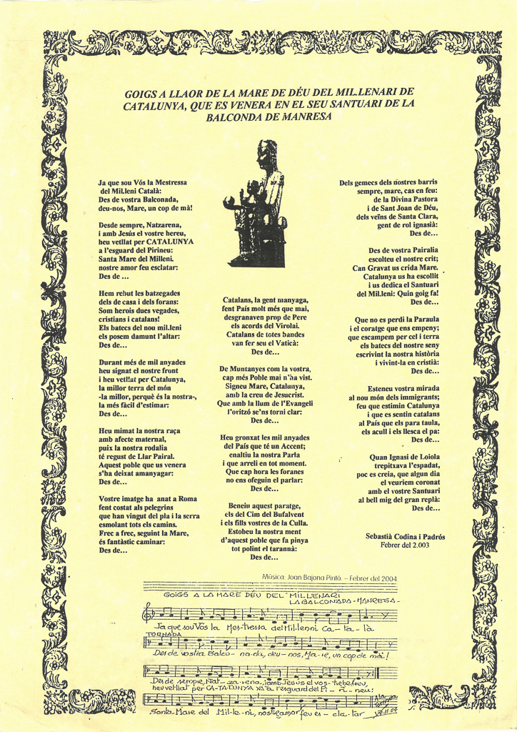 GOIGS A LLAOR DE LA MARE DE DÉU DEL MIL·LENARI DE CATALUNYA, QUE ES VENERA EN EL SEU SANTUARI DE LA BALCONADA DE MANRESA