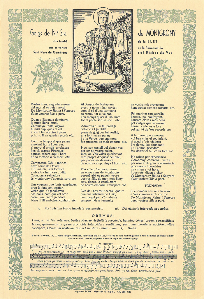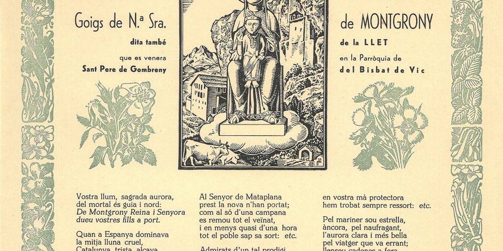 GOIGS DE N.ª SRA. DE MONTGRONY, DITA TAMBÉ DE LA LLET, QUE ES VENERA EN LA PARRÒQUIA DE SANT PERE DE GOMBRENY DEL BISBAT DE VIC