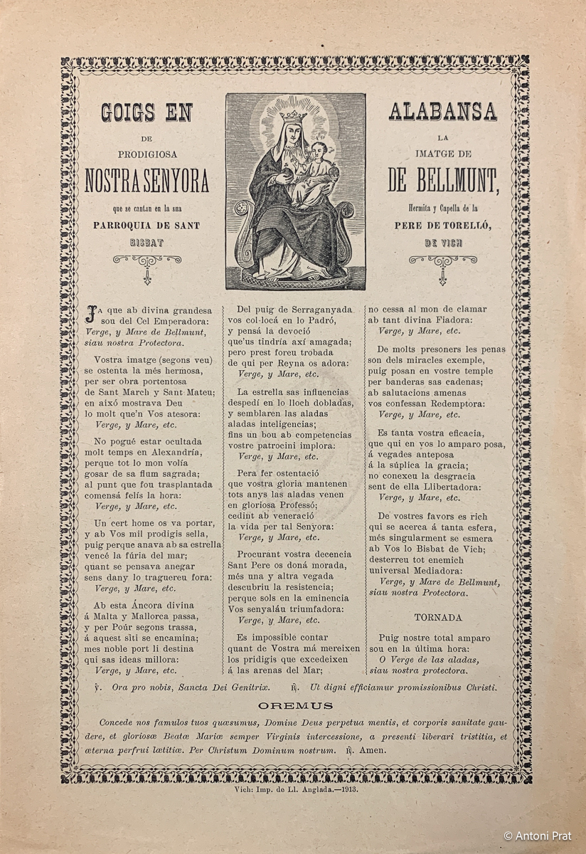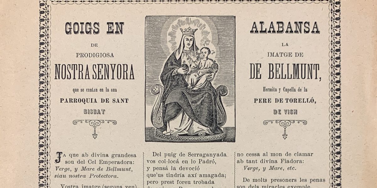 GOIGS EN ALABANSA DE LA PRODIGIOSA IMATGE DE NOSTRA SENYORA DE BELLMUNT, QUE SE CANTAN EN LA SUA HERMITA Y CAPELLA DE LA PARROQUIA DE SANT PERE DE TORELLÓ, BISBAT DE VICH