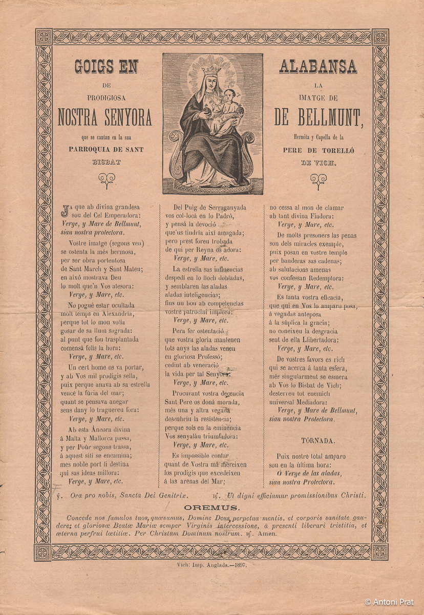 GOIGS EN ALABANSA DE LA PRODIGIOSA IMATGE DE NOSTRA SENYORA DE BELLMUNT, QUE SE CANTAN EN LA SUA HERMITA Y CAPELLA DE LA PARRÓQUIA DE SANT PERE DE TORELLÓ, BISBAT DE VICH