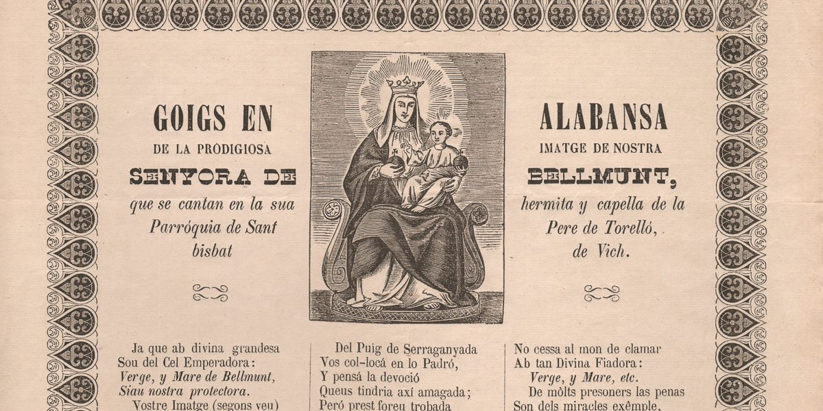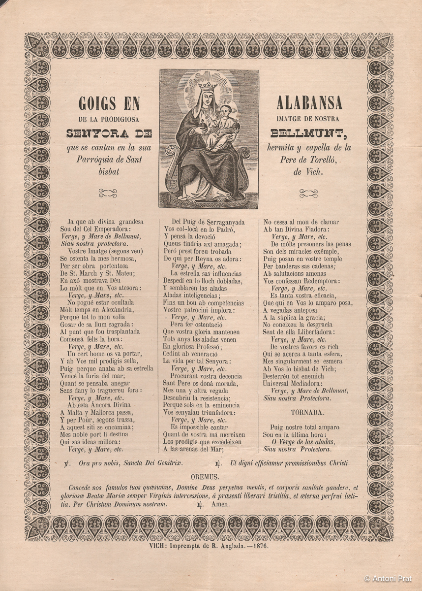 GOIGS EN ALABANSA DE LA PRODIGIOSA IMATGE DE NOSTRA SENYORA DE BELLMUNT, QUE SE CANTAN EN LA SUA HERMITA Y CAPELLA DE LA PARRÓQUIA DE SANT PERE DE TORELLÓ, BISBAT DE VICH