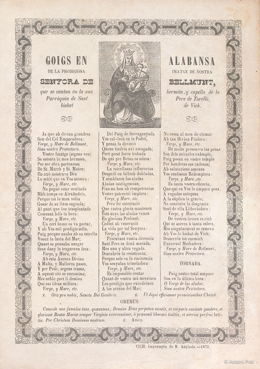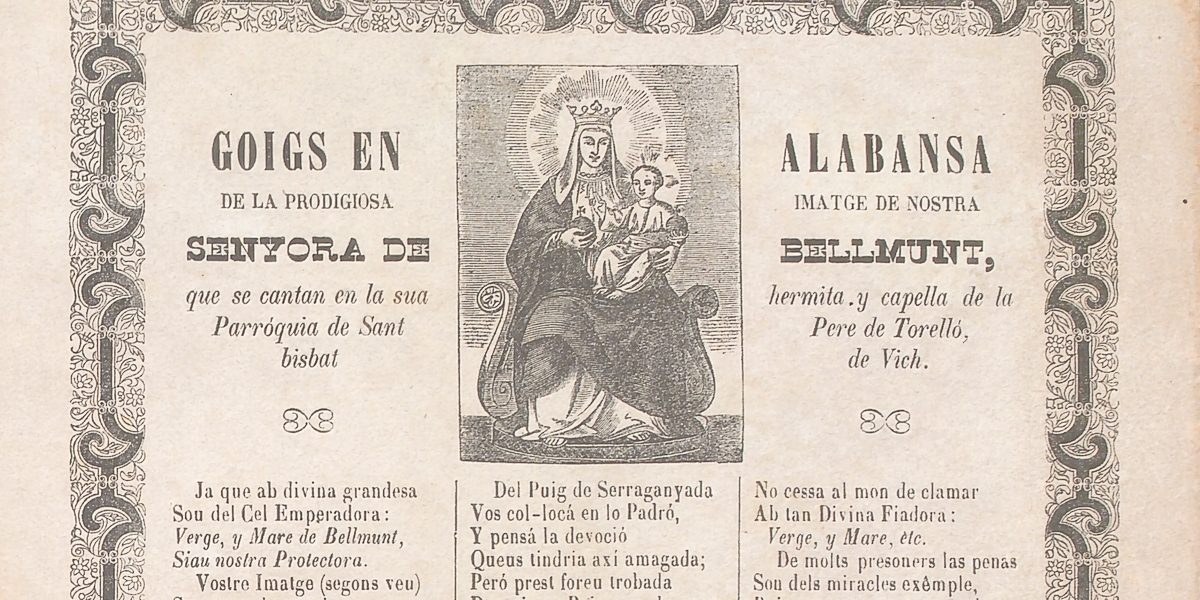 GOIGS EN ALABANSA DE LA PRODIGIOSA IMATGE DE NOSTRA SENYORA DE BELLMUNT, QUE SE CANTAN EN LA SUA HERMITA, Y CAPELLA DE LA PARRÓQUIA DE SANT PERE DE TORELLÓ, BISBAT DE VICH