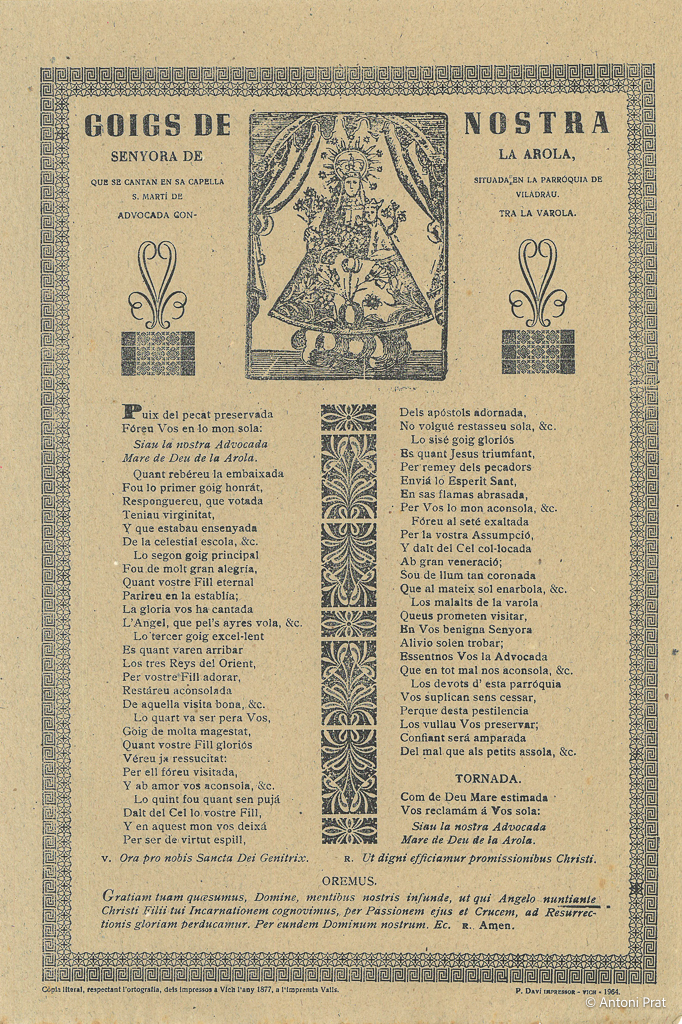 GOIGS DE NOSTRA SENYORA DE LA AROLA, QUE SE CANTAN EN SA CAPELLA SITUADA EN LA PARROQUIA DE S. MARTÍ DE VILADRAU, ADVOCADA CONTRA LA VAROLA