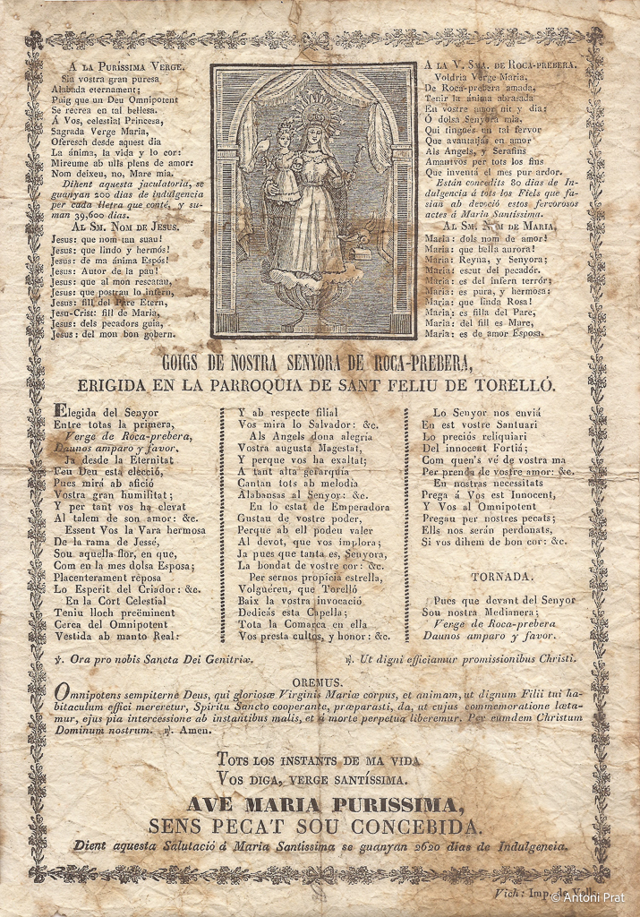 GOIGS DE NOSTRA SENYORA DE ROCA-PREBERA, ERIGIDA EN LA PARROQUIA DE SANT FELIU DE TORELLÓ