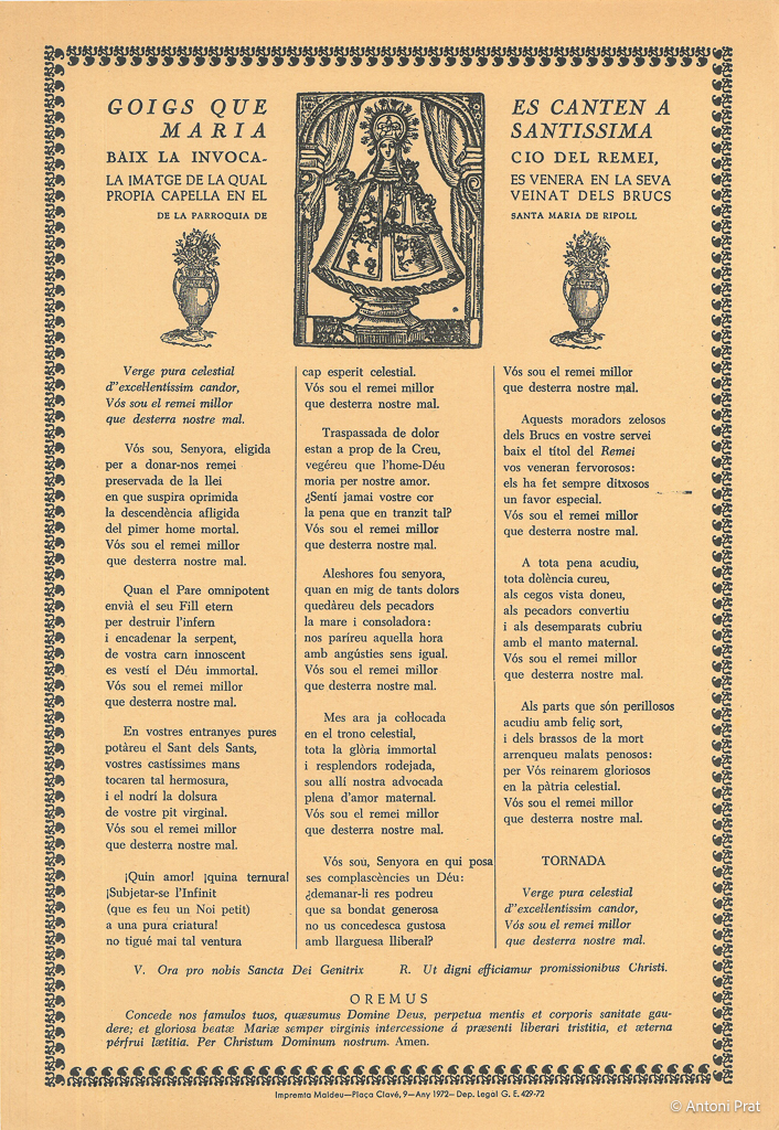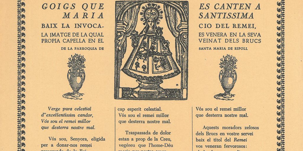GOIGS QUE ES CANTEN A MARIA SANTISSIMA BAIX LA INVOCACIO DEL REMEI, LA IMATGE DE LA QUAL ES VENERA EN LA SEVA PROPIA CAPELLA EN EL VEINAT DELS BRUCS DE LA PARROQUIA DE SANTA MARIA DE RIPOLL