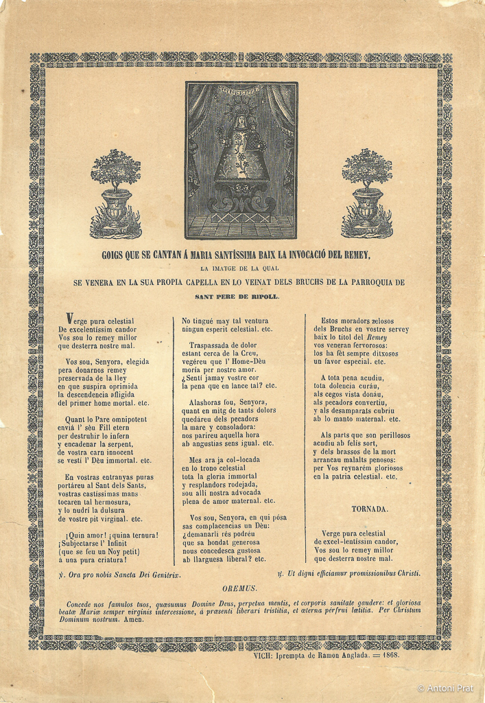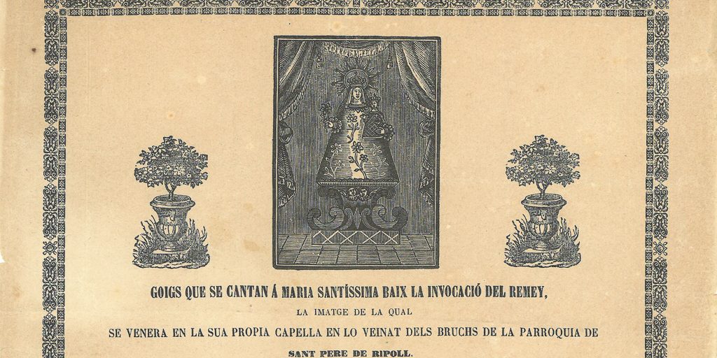 GOIGS QUE SE CANTAN Á MARIA SANTÍSSIMA BAIX LA INVOCACIÓ DEL REMEY, LA IMATGE DE LA QUAL SE VENERA EN LA SUA PROPIA CAPELLA EN LO VEINAT DELS BRUCHS DE LA PARROQUIA DE SANT PERE DE RIPOLL