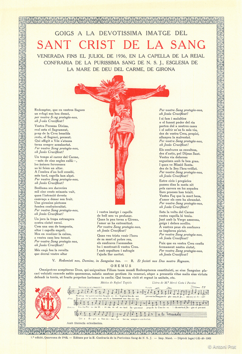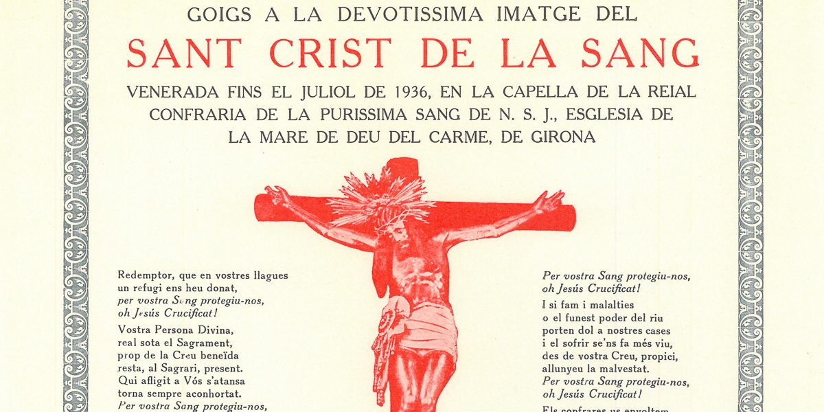 GOIGS A LA DEVOTISSIMA IMATGE DEL SANT CRIST DE LA SANG VENERADA FINS EL JULIOL DE 1936, EN LA CAPELLA DE LA REIAL CONFRARIA DE LA PURISSIMA DE N. S. J., ESGLESIA DE LA MARE DE DEU DEL CARME, DE GIRONA
