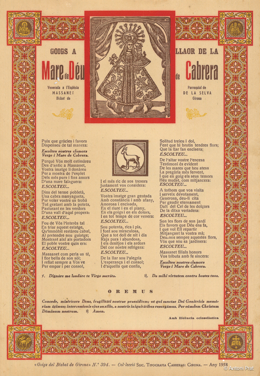 GOIGS A LLAOR DE LA MARE DE DÉU DE CABRERA, VENERADA A L’ESGLÉSIA PARROQUIAL DE MASSANET DE LA SELVA BISBAT DE GIRONA