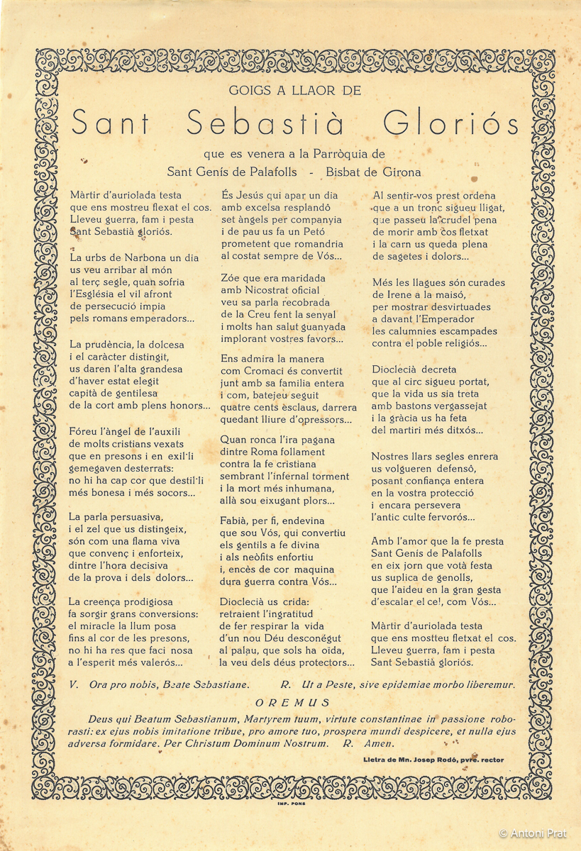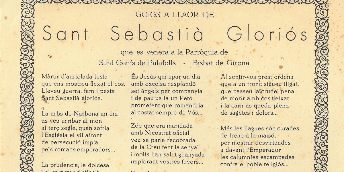 GOIGS A LLAOR DE SANT SEBASTIÀ GLORIÓS QUE ES VENERA A LA PARRÒQUIA DE SANT GENÍS DE PALAFOLLS – BISBAT DE GIRONA
