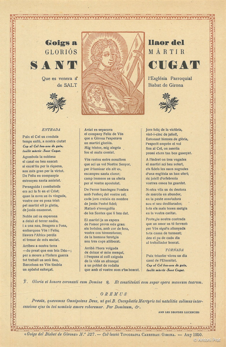 GOIGS A LLAOR DEL GLORIÓS MÁRTIR SANT CUGAT, QUE ES VENERA A L’ESGLÉSIA PARROQUIAL DE SALT, BISBAT DE GIRONA