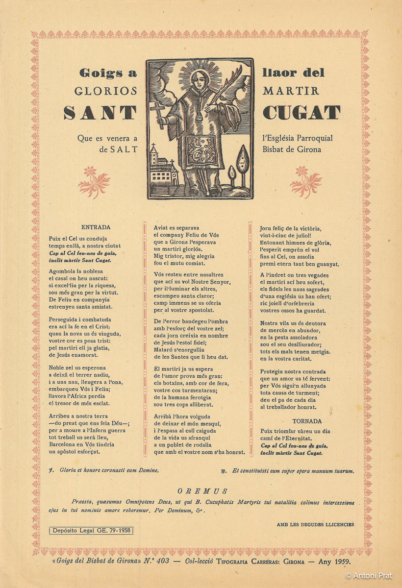 GOIGS A LLAOR DEL GLORIOS MARTIR SANT CUGAT QUE ES VENERA A L’ESGLÉSIA PARROQUIAL DE SALT, BISBAT DE GIRONA