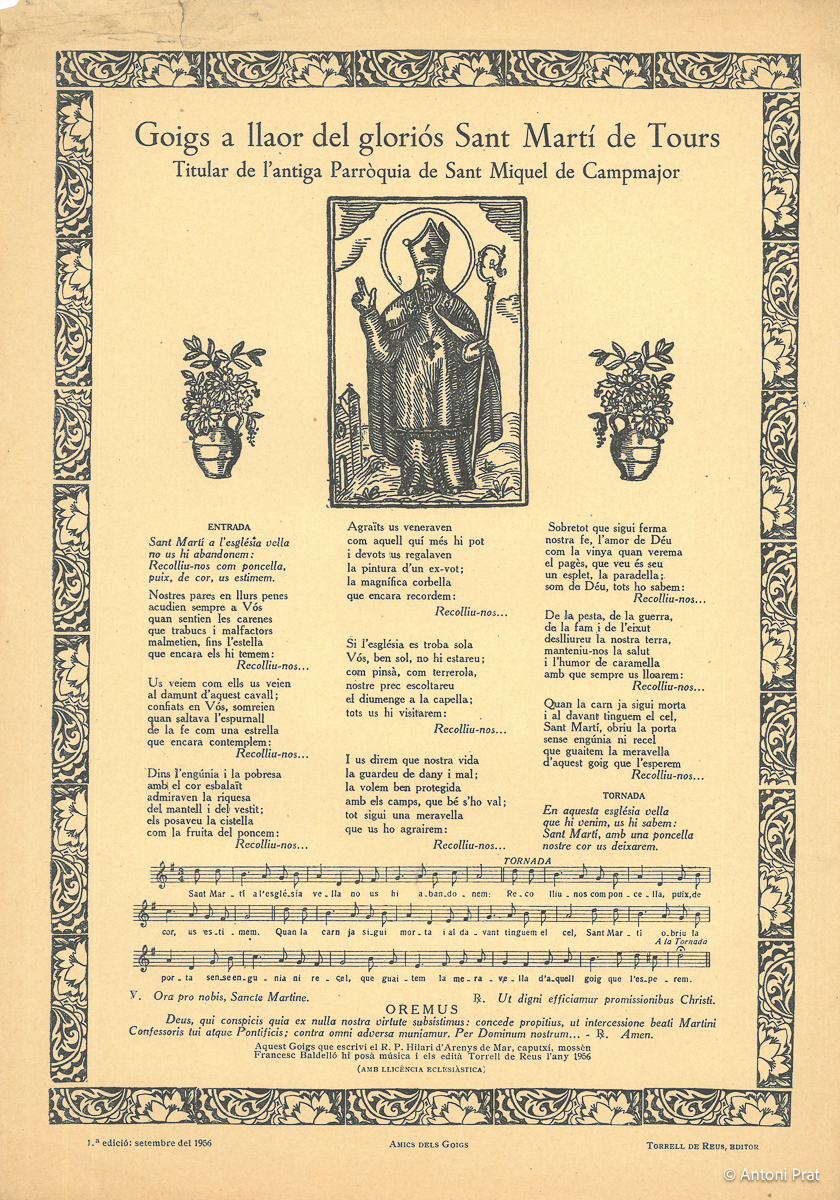 GOIGS A LLAOR DEL GLORIÓS SANT MARTÍ DE TOURS TITULAR DE L’ANTIGA PARRÒQUIA DE SANT MIQUEL DE CAMPMAJOR