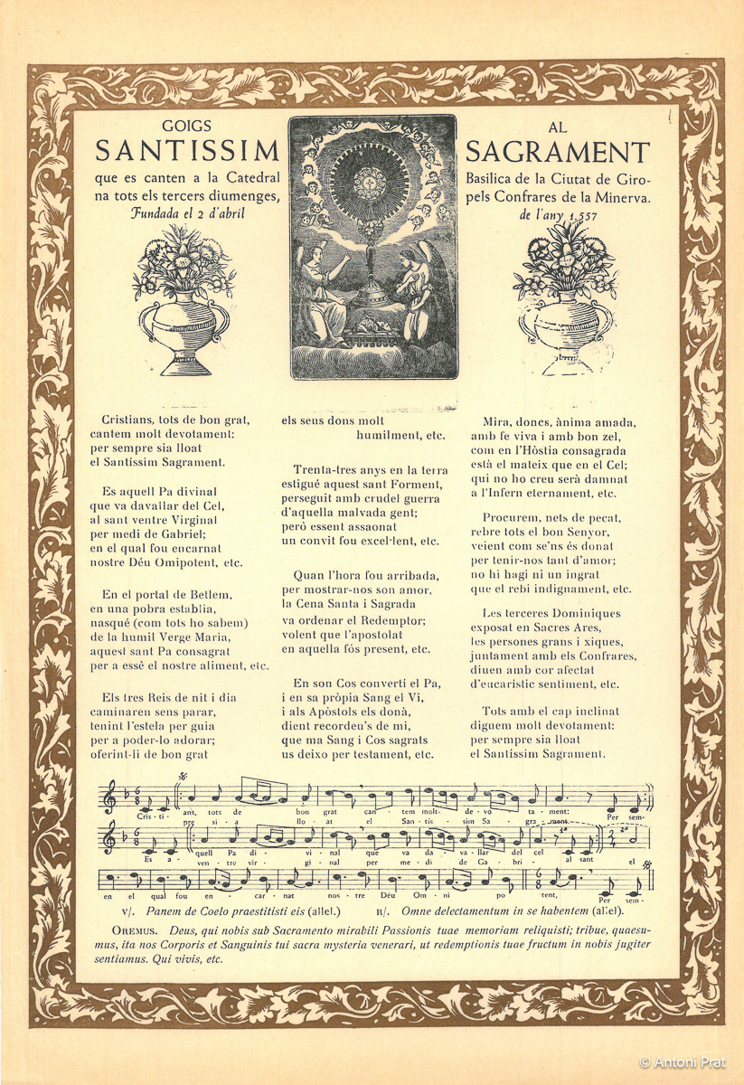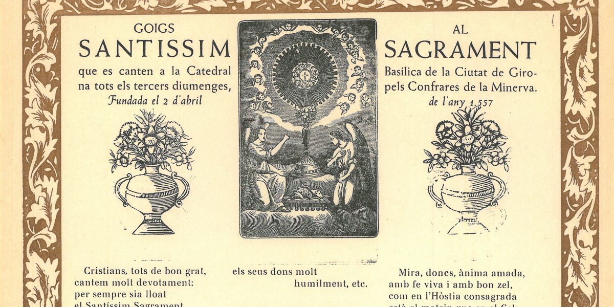 GOIGS AL SANTISSIM SAGRAMENT QUE ES CANTEN A LA CATEDRAL BASILICA DE LA CIUTAT DE GIRONA TOTS ELS TERCERS DIUMENGES, PELS CONFRARES DE LA MINERVA. FUNDADA EL 2 D’ABRIL DE L’ANY 1557