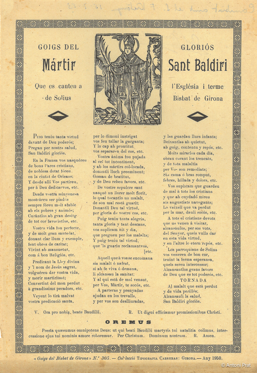 GOIGS DEL GLORIÓS MÁRTIR SANT BALDIRI QUE ES CANTEN A L’ESGLÉSIA I TERME DE SOLIUS BISBAT DE GIRONA