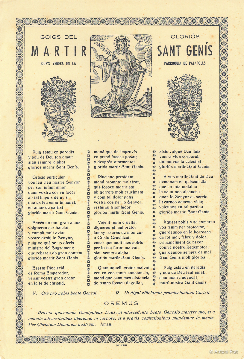 GOIGS DEL GLORIÓS MARTIR SANT GENÍS, QUE’S VENERA EN LA PARROQUIA DE PALAFOLLS