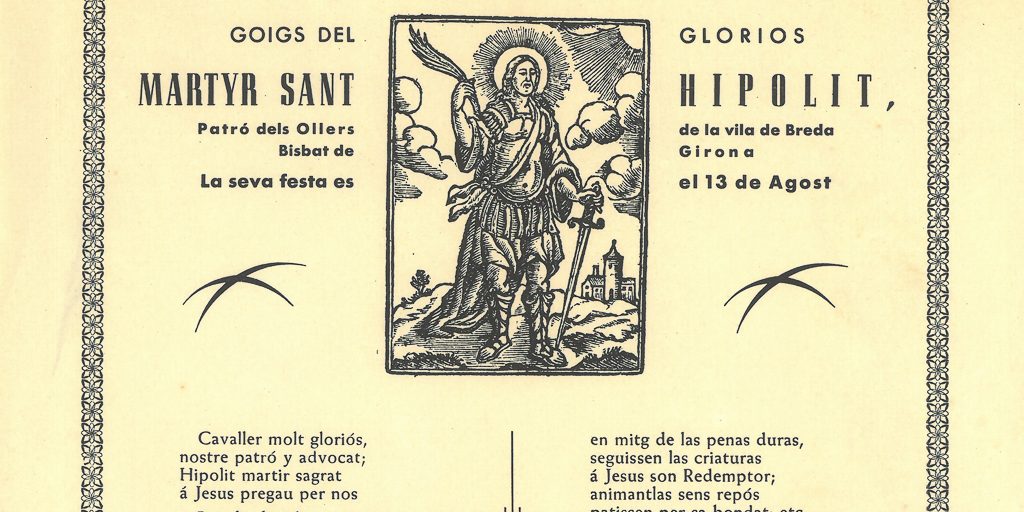 GOIGS DEL GLORIOS MARTYR SANT HIPOLIT, PATRÓ DELS OLLERS DE LA VILA DE BREDA BISBAT DE GIRONA