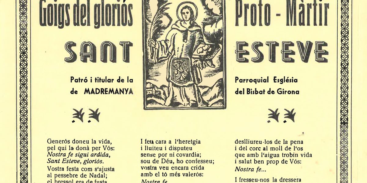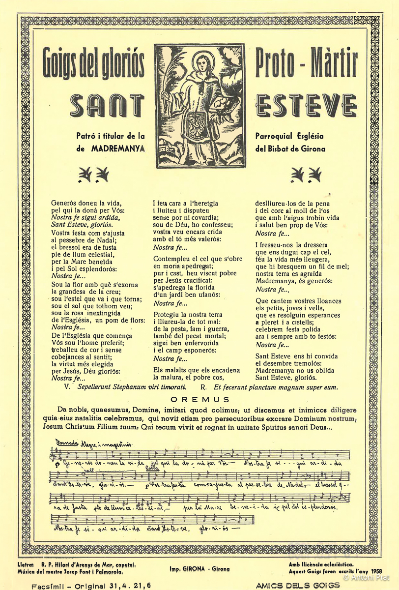 GOIGS DEL GLORIÓS PROTO-MÀRTIR SANT ESTEVE, PATRÓ I TITULAR DE LA PARROQUIAL ESGLÉSIA DE MADREMANYA DEL BISBAT DE GIRONA