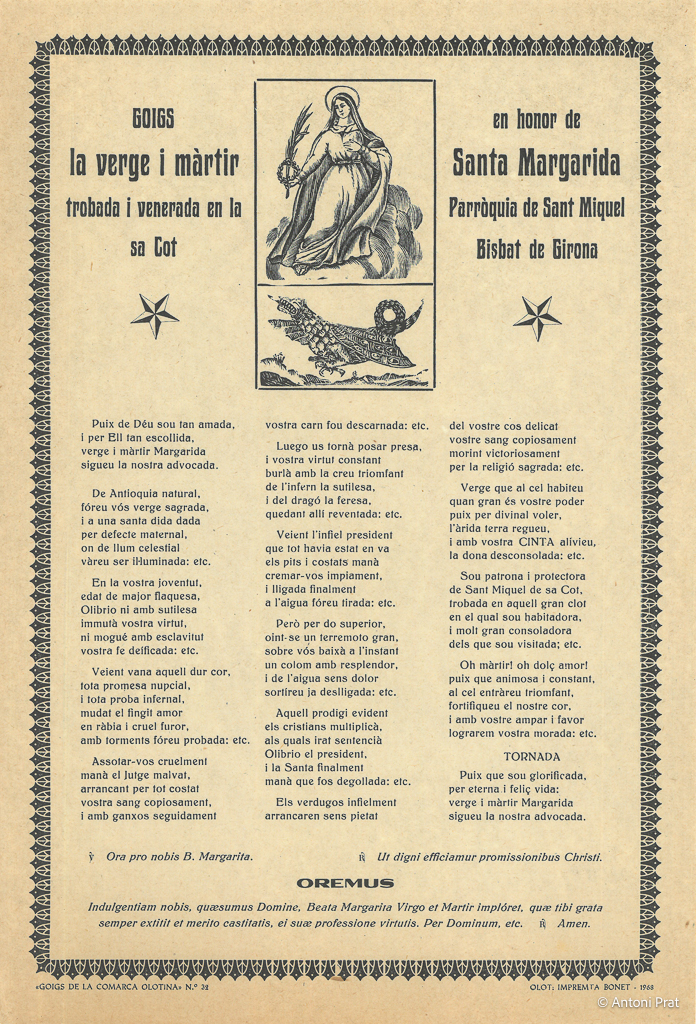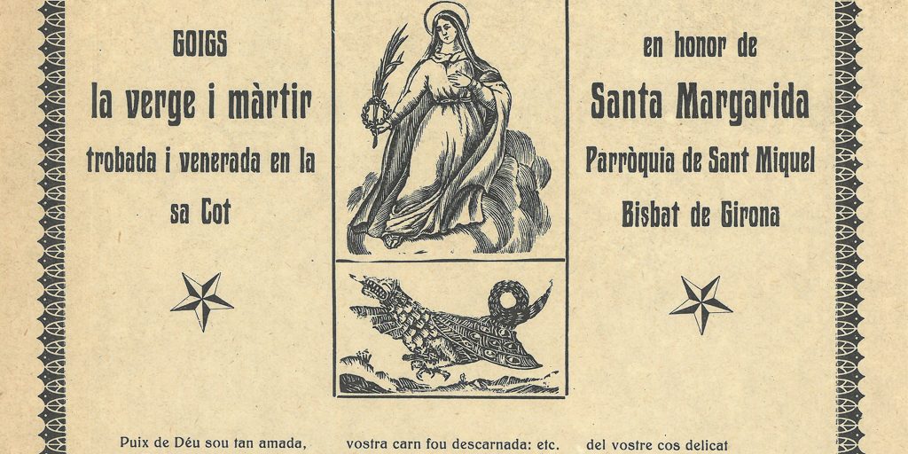 GOIGS EN HONOR DE LA VERGE I MÀRTIR SANTA MARGARIDA TROBADA I VENERADA EN LA PARRÒQUIA DE SANT MIQUEL SA COT BISBAT DE GIRONA