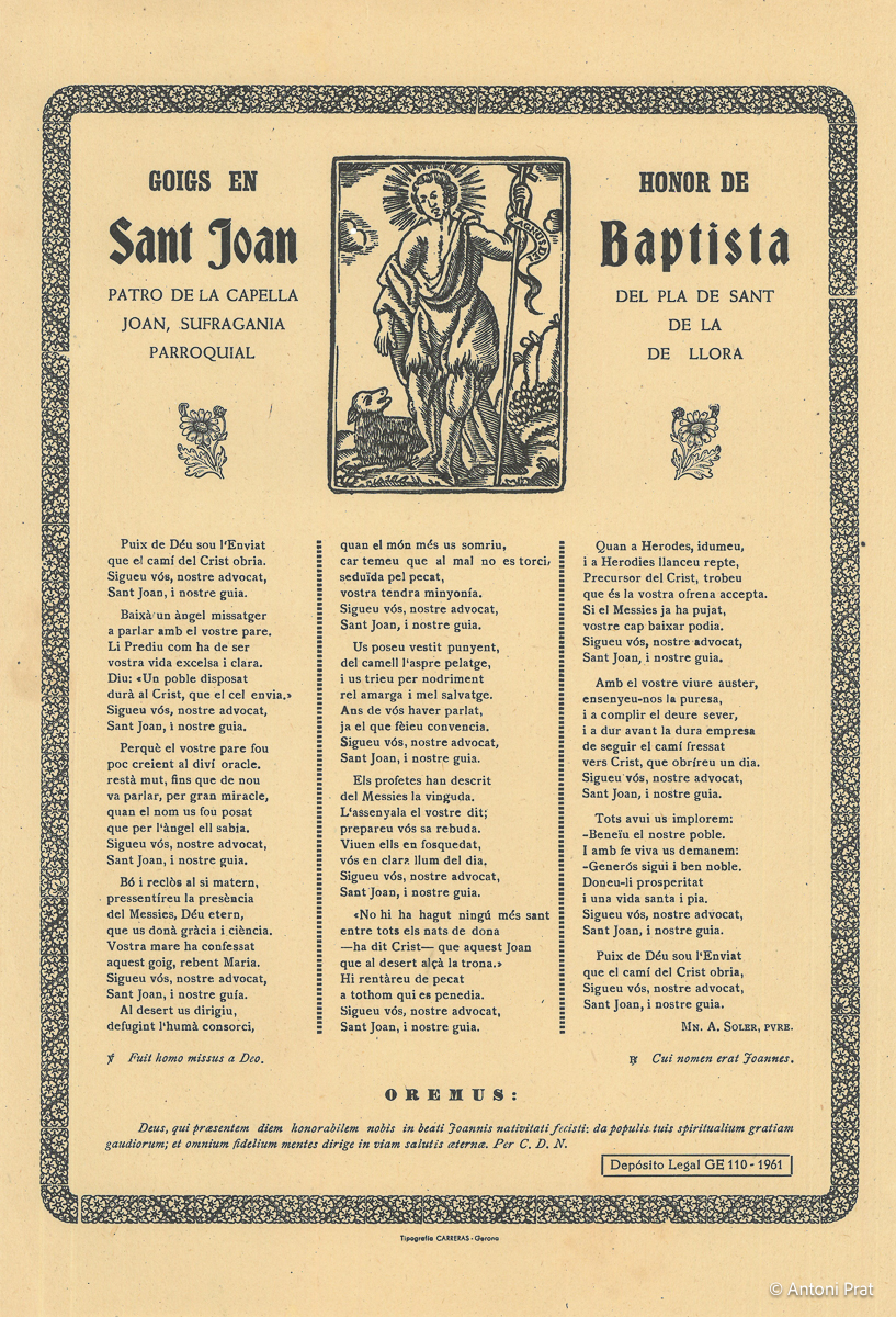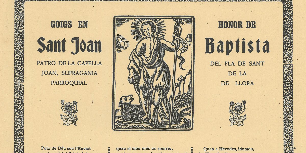 GOIGS EN HONOR DE SANT JOAN BAPTISTA PATRO DE LA CAPELLA DEL PLA DE SANT JOAN, SUFRAGANIA DE LA PARROQUIAL DE LLORA