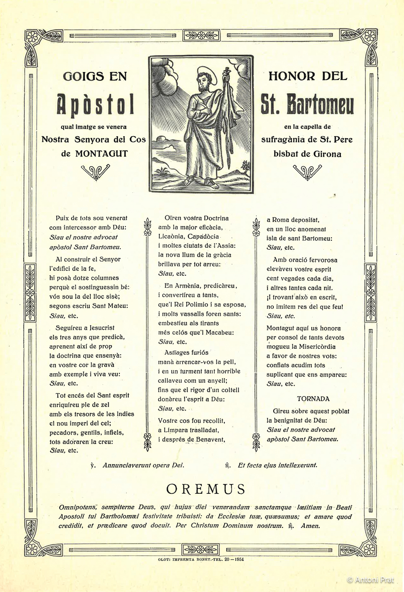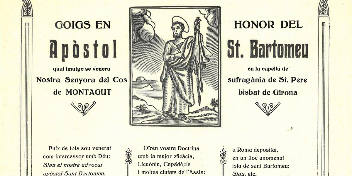 GOIGS EN HONOR DEL APÒSTOL ST. BARTOMEU QUAL IMATGE SE VENERA EN LA CAPELLA DE NOSTRA SENYORA DEL COS SUFRAGÀNIA DE ST. PERE DE MONTAGUT BISBAT DE GIRONA