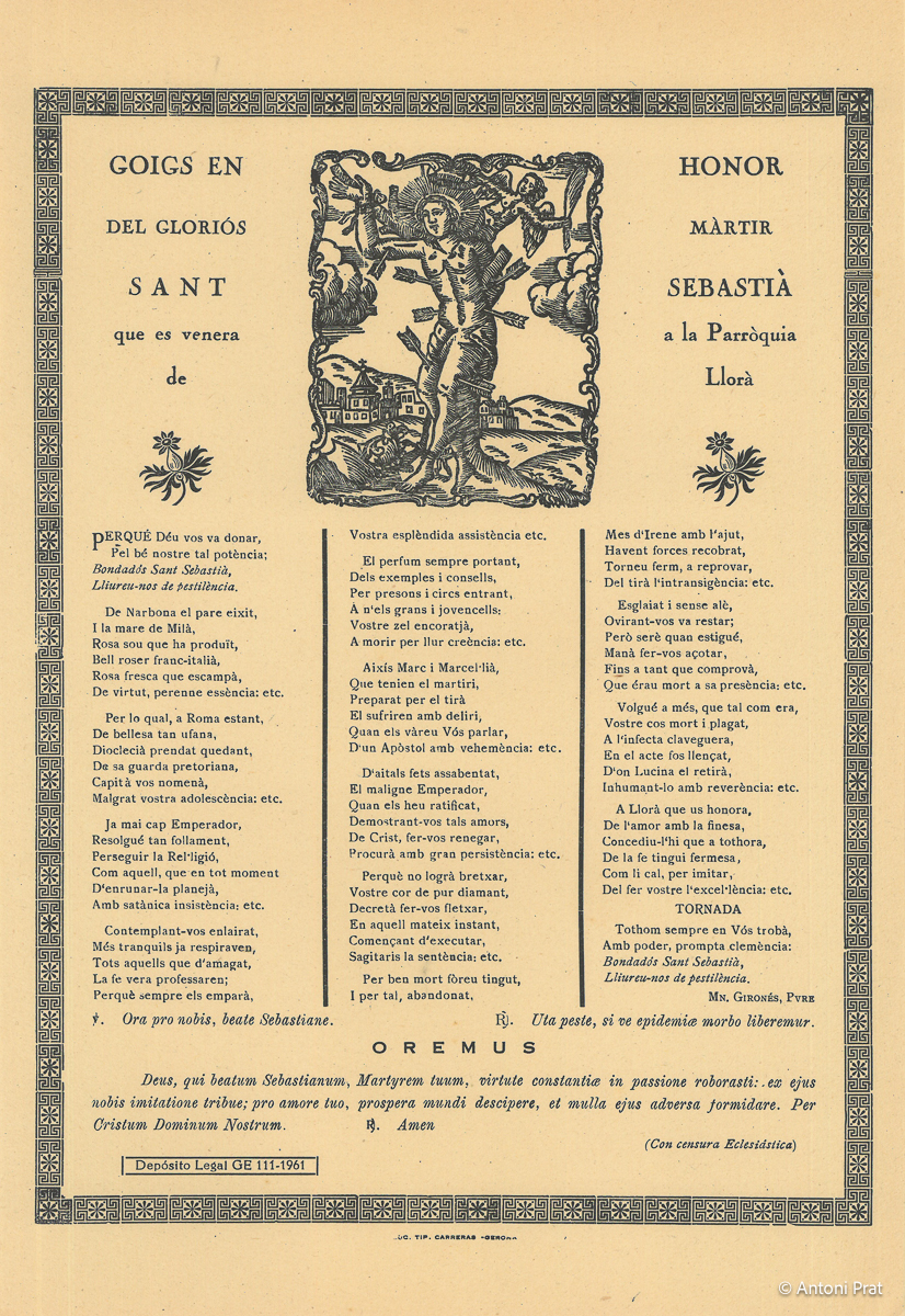 GOIGS EN HONOR DEL GLORIÓS MÀRTIR SANT SEBASTIÀ QUE ES VENERA A LA PARRÒQUIA DE LLORÀ