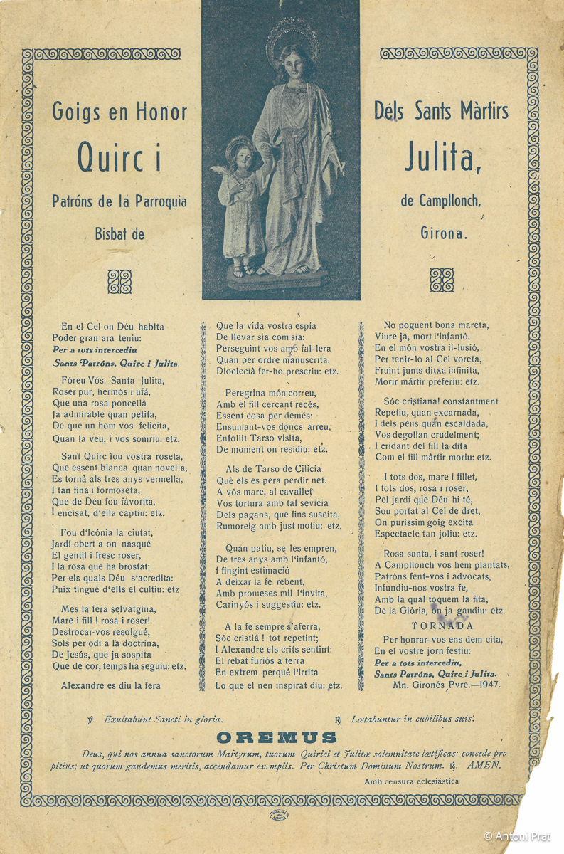 GOIGS EN HONOR DELS SANTS MÀRTIRS QUIRC I JULITA, PATRÓNS DE LA PARROQUIA DE CAMPLLONCH, BISBAT DE GIRONA