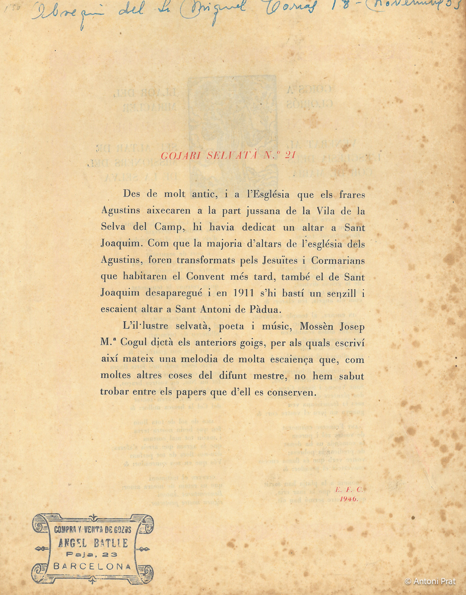 Gojari Selvatà N.º 21. Amb retall d’història signat per E. F. C.