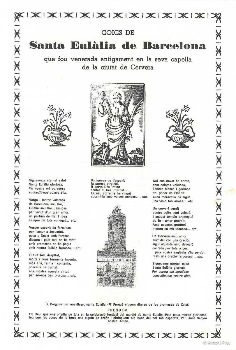 GOIGS DE SANTA EULÀLIA DE BARCELONA, QUE FOU VENERADA ANTIGAMENT EN LA SEVA CAPELLA DE LA CIUTAT DE CERVERA