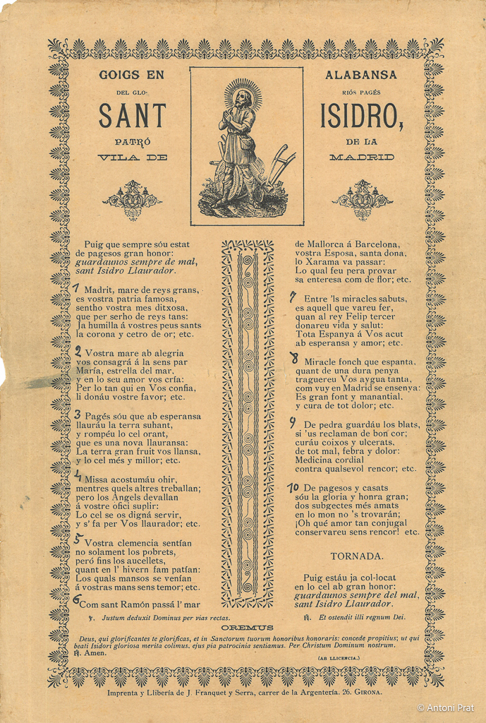 GOIGS EN ALABANSA DEL GLORIÓS PAGÉS SANT ISIDRO, PATRÓ DE LA VILA DE MADRID