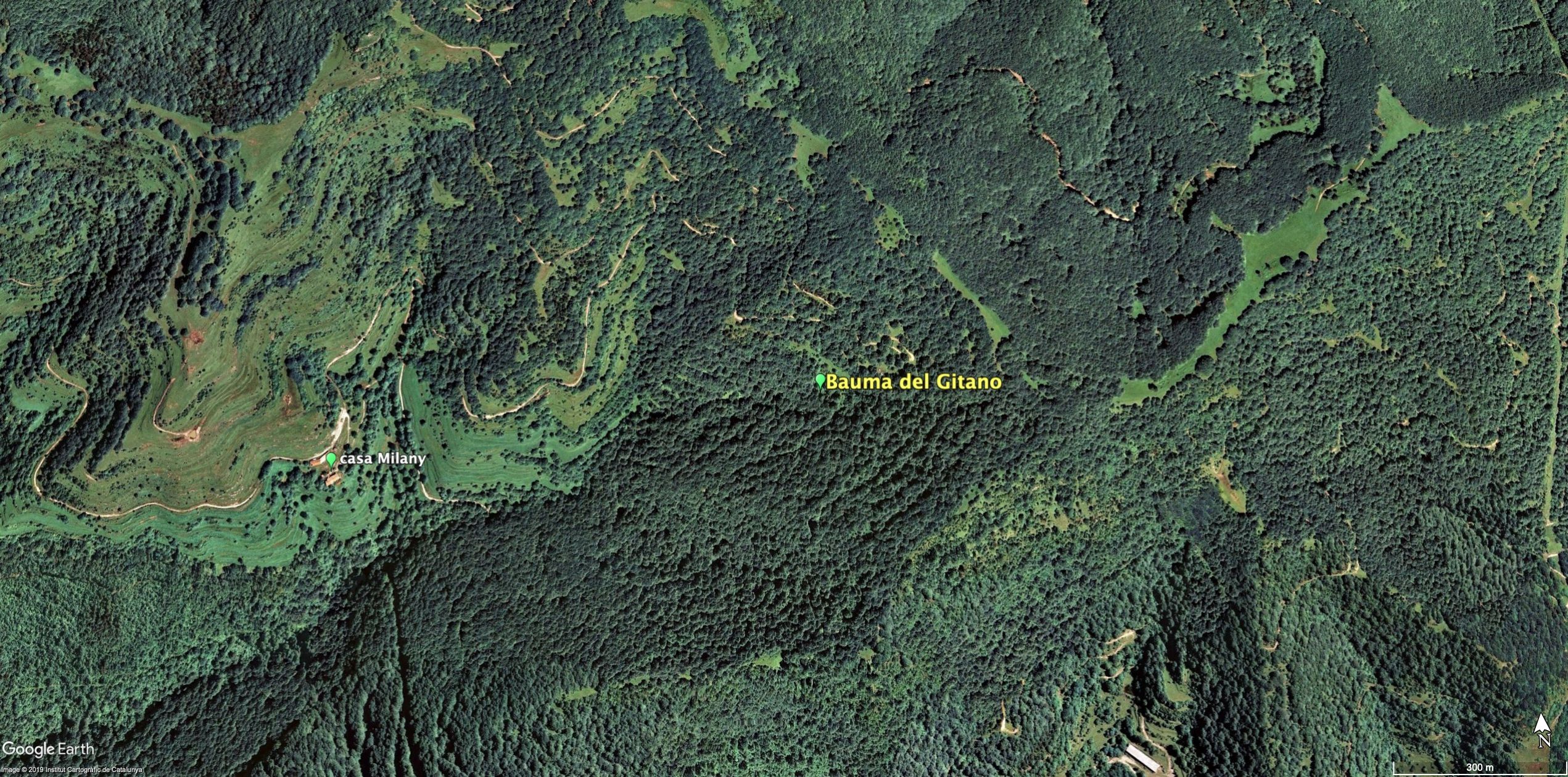 Bauma situada enmig del torrent de Milany, uns metres per sobre de la carretera que porta a la casa. Es tracta d’una bauma fonda i humida, no gaire alta, i amb la roca conglomerada típica de les parts altes d’aquesta serra.
