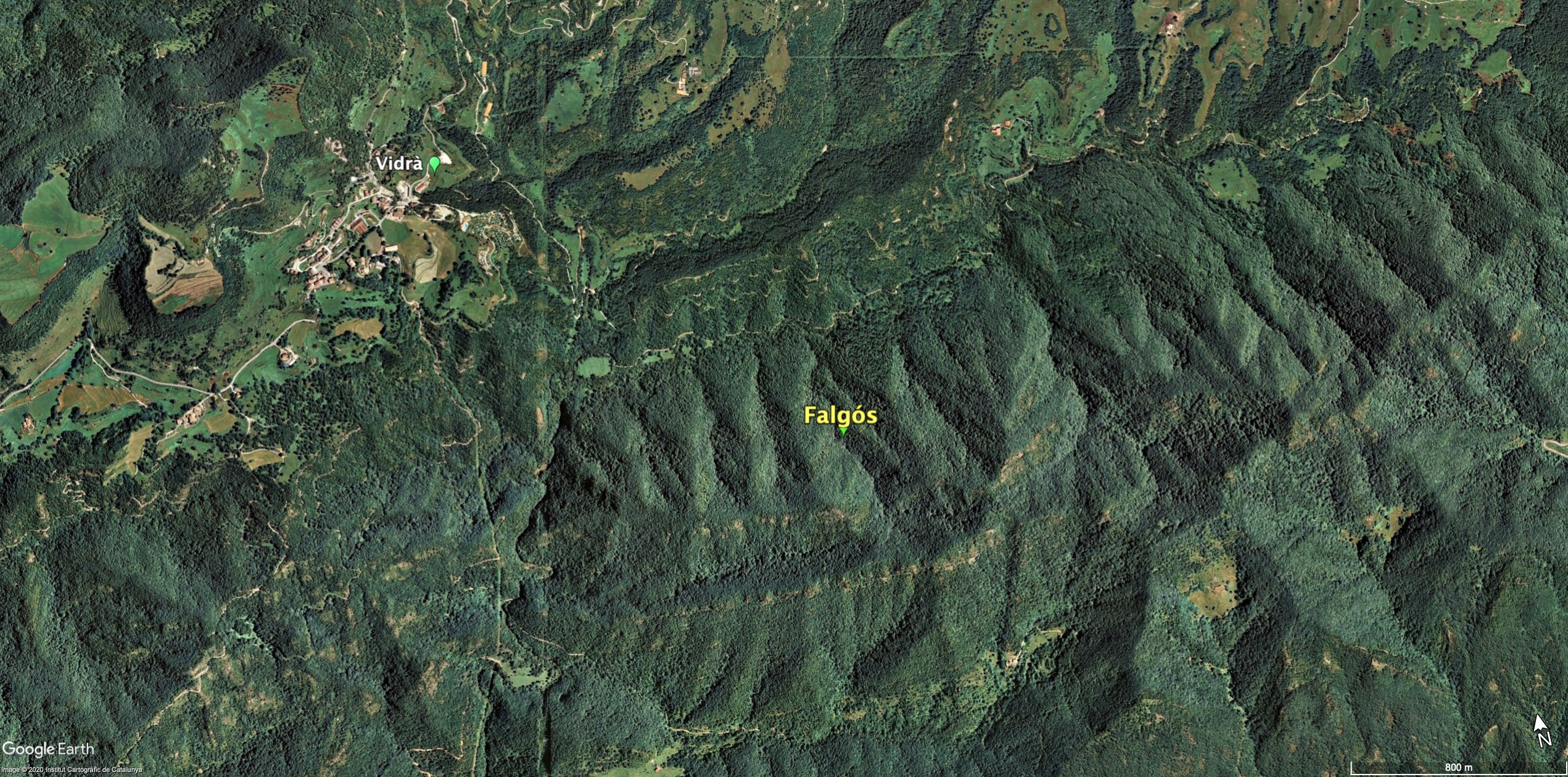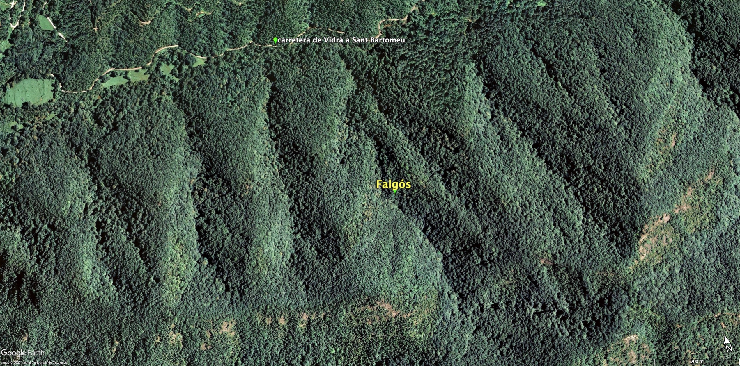 Just a sota d’aquesta afrau, on no hi ha pràcticament cap planell ni feixa, en una fageda de conte de fades que fa molts i molts anys que no es tala perquè tan amunt no hi ha arribat mai cap pista de desforestar, és on es troben les restes del que fou una antiga construcció. Falgós, doncs, semblaria més aviat un lloc adient per a un carboner, un llenyataire, o fins i tot per un fugitiu o un anacoreta, que no pas per un pobre pagès, que allí dalt devia tenir treballs a sobreviure.