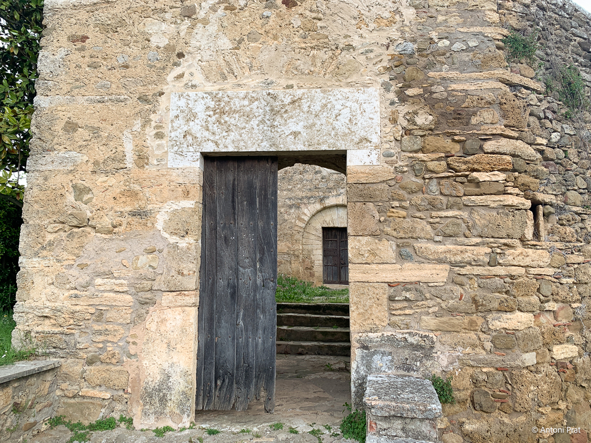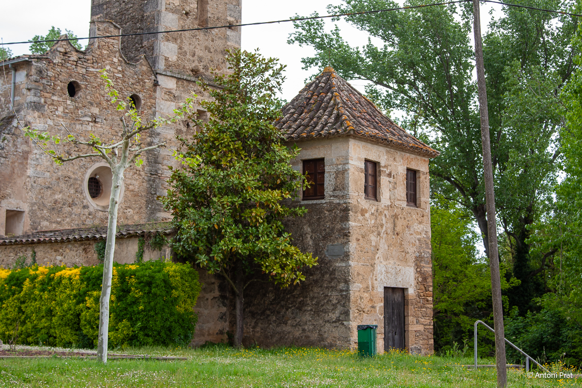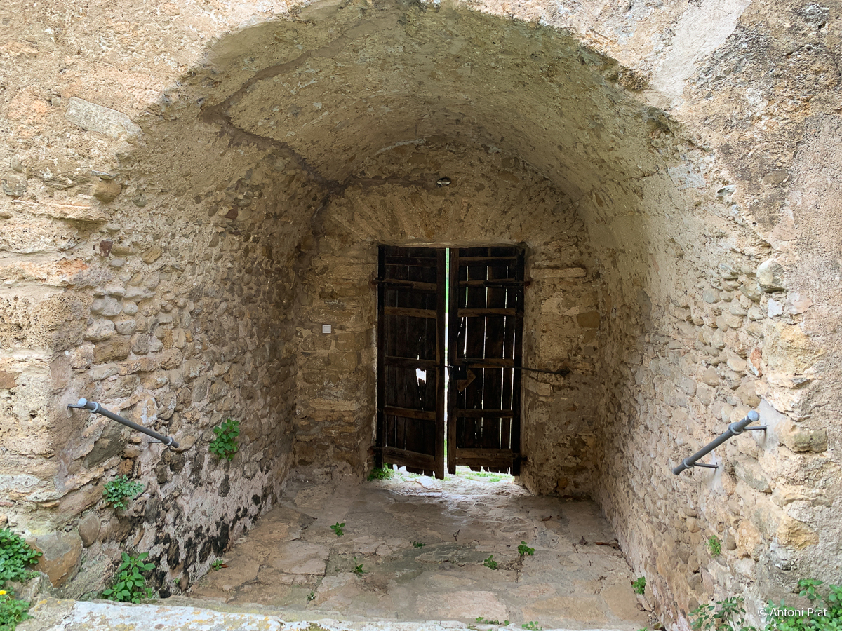 A la planta inferior hi trobem la porta exterior d’entrada, que comunica amb una gran arcada que el travessa formant un petit túnel, utilitzat únicament com a pas. Quatre grans esglaons ens condueixen fins a la planta de l’església.