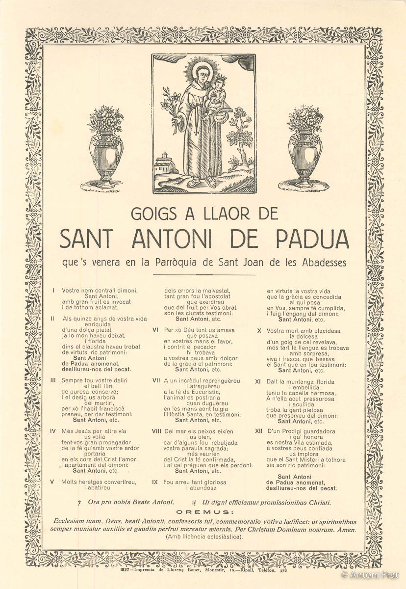 L’ermita de Sant Antoni de Pàdua es troba al punt més alt de Sant Joan de les Abadesses, a 1011 metres. Construïda el 1635 al cim d’un turó, que des d’aleshores s’anomena muntanya de Sant Antoni. Fou cremada durant la Guerra dels Carlins, reedificada el 1852 i embellida amb nous altars el 1858. En la llinda de la porta d’entrada hi ha anotat l’any 1758.
