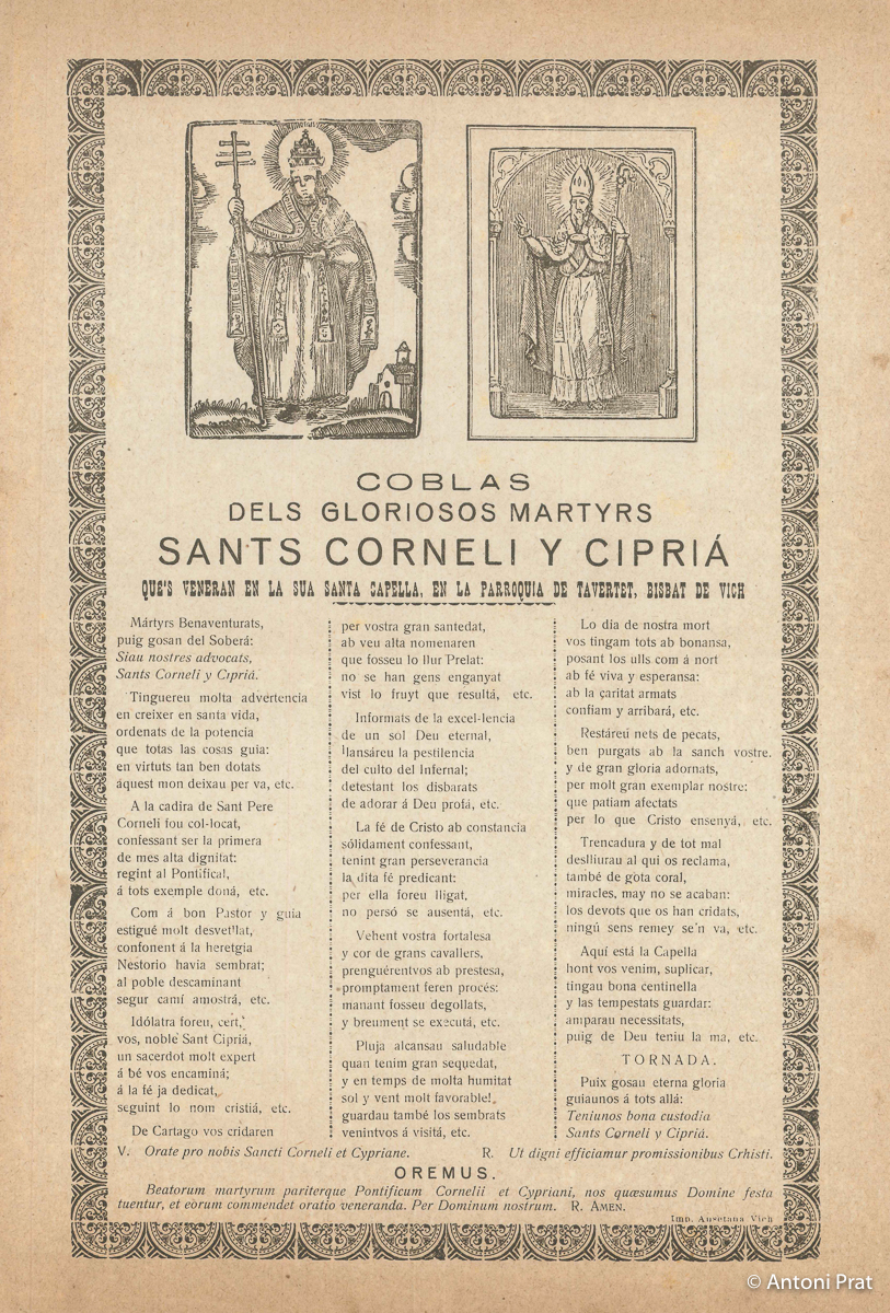 Església romànica documentada l’any 1292. Consta que l’any 1305 la capella tenia ermitans. Des de Tavertet s’hi pujava en processó per les lletanies de l’Ascensió i el Dilluns de Pasqua. El dia dels sants patrons, Corneli i Cebrià, s’hi feia un important i concorregut aplec, on s’hi cantaven els goigs dels sants Corneli i Cipriá