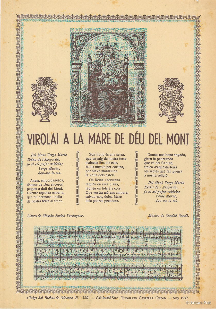 La imatge de la Mare de Déu del Mont és una talla gòtica del segle XIV, treballada en alabastre policromat, extret de la pedrera de Segueró, situat sota la muntanya. Conta la llegenda que un pastor atalaiava el seu ramat de vaques pels alts de la muntanya, quan, repetidament, va observar que una vaca tenia el costum de ficar el cap en un trau de la penya cimal. Encuriosit va mirar que hi podia haver a dins, i es va trobar amb la imatge de la Mare de Déu. La va agafar i la va dur al monestir de sant Llorenç, on la comunitat de monjos benedictins li va alçar un altar a l’església.