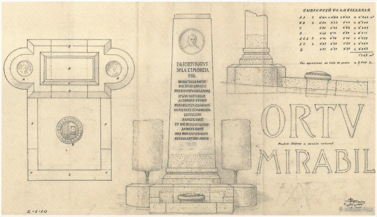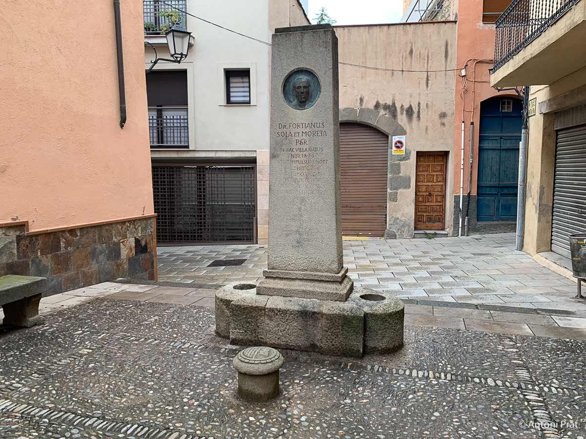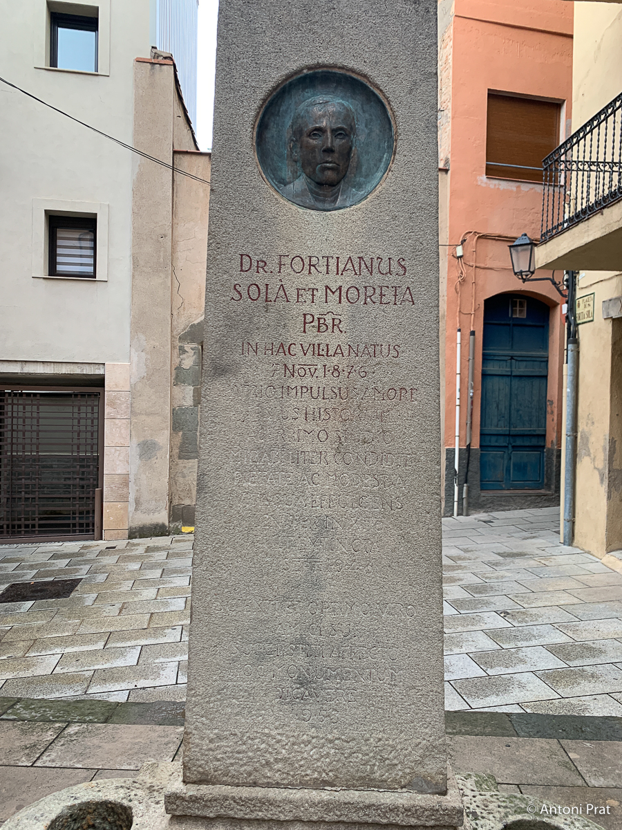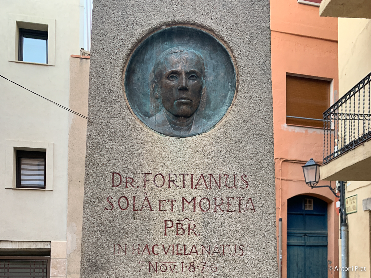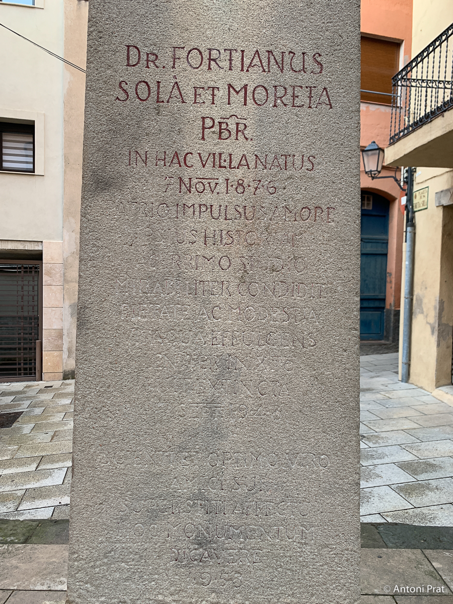 DR. FORTIANUS / SOLÀ ET MORETA / PBR. / IN HAC VIL·LA NATUS / 7 NOV. 1·8·7·6 / PATRIO IMPULSUS AMORE / IPSIUS HISTORIAM / ACERRIMO STUDIO / MIRABILITER CONDIDIT / PIETATE AC MODESTIA / VITA SUA EFFULGENS / LENITER IN XPO / FUIT EXTINCTA / 17 SEPT 1·9·4·8 / SCIENTI ET OPTIMO VIRO / AMICI SUI / SUPEBSTITI AFFECTU / HOC MONUMENTUM / DICAVERE / 1953
