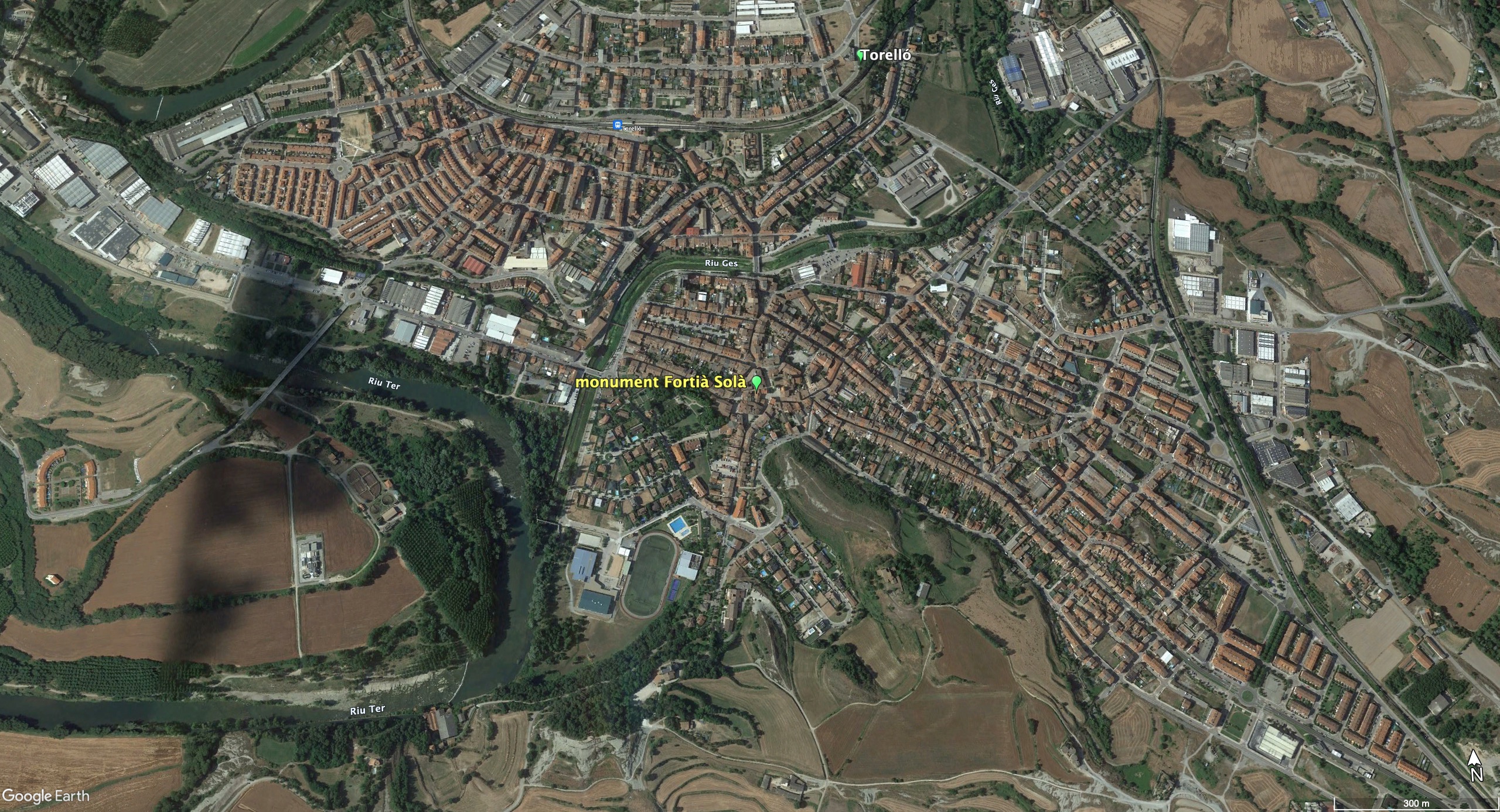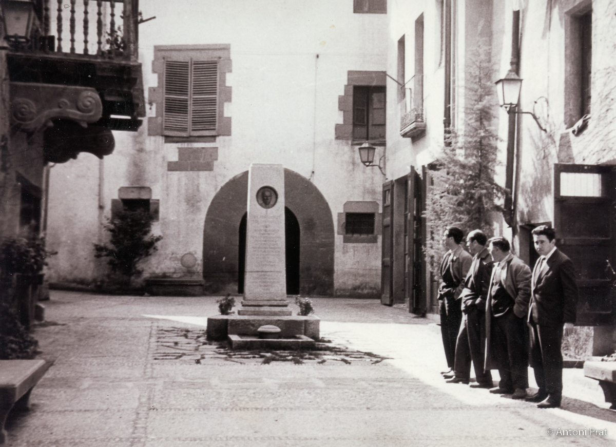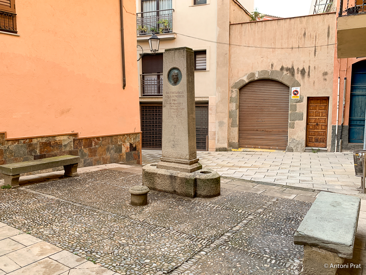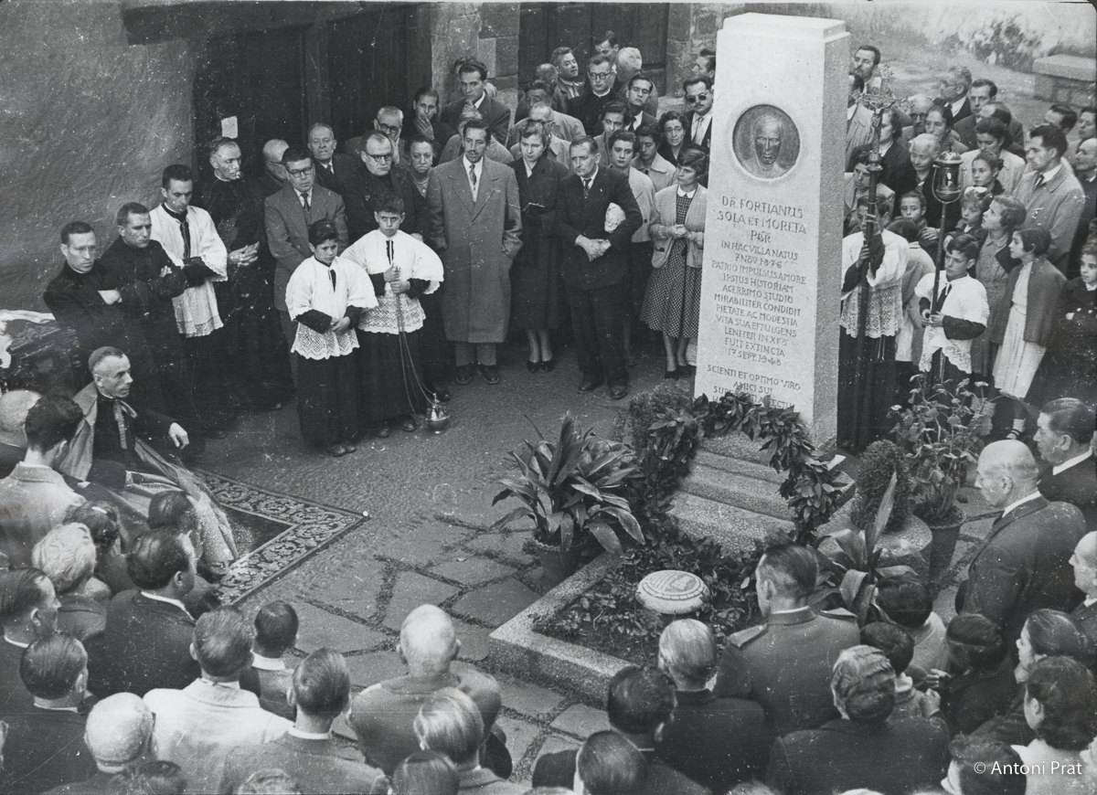 DR. FORTIANUS / SOLÀ ET MORETA / PBR. / IN HAC VIL·LA NATUS / 7 NOV. 1·8·7·6 / PATRIO IMPULSUS AMORE / IPSIUS HISTORIAM / ACERRIMO STUDIO / MIRABILITER CONDIDIT / PIETATE AC MODESTIA / VITA SUA EFFULGENS / LENITER IN XPO / FUIT EXTINCTA / 17 SEPT 1·9·4·8 / SCIENTI ET OPTIMO VIRO / AMICI SUI / SUPEBSTITI AFFECTU / HOC MONUMENTUM / DICAVERE / 1953