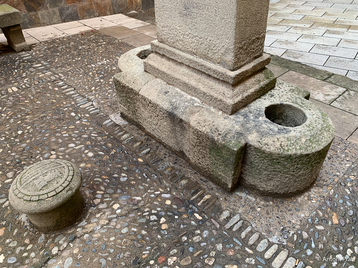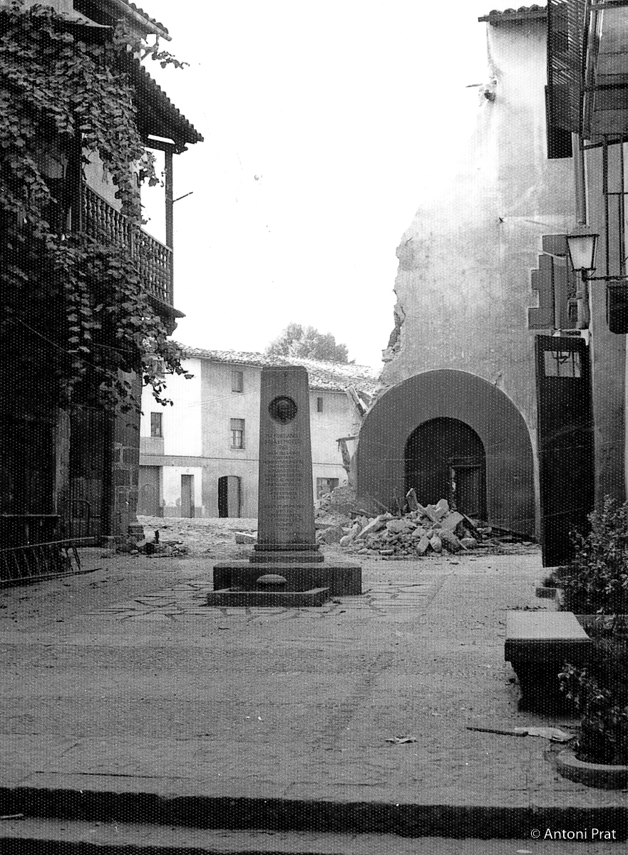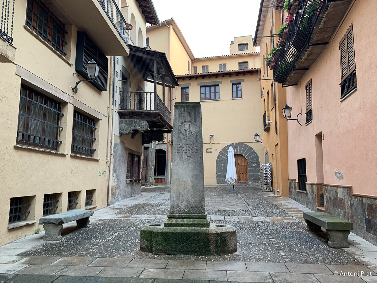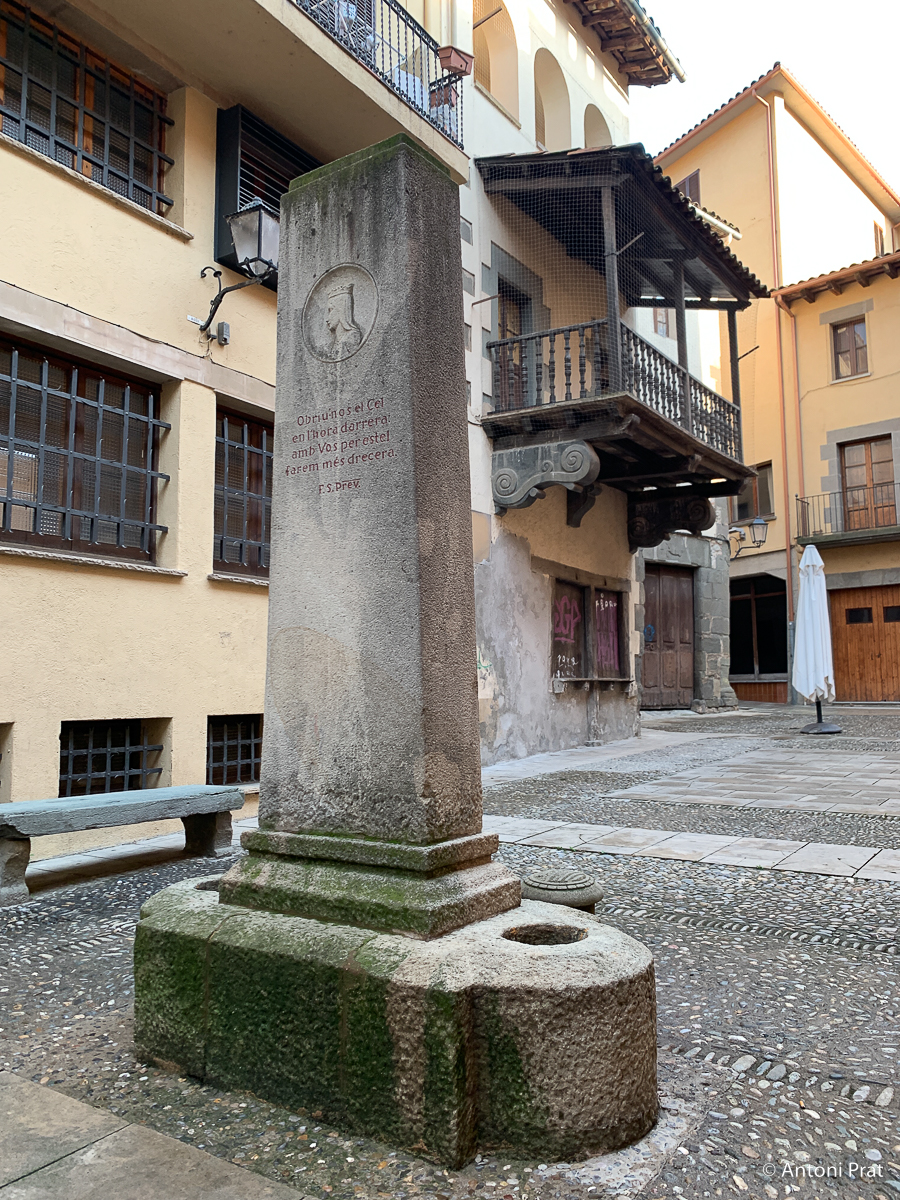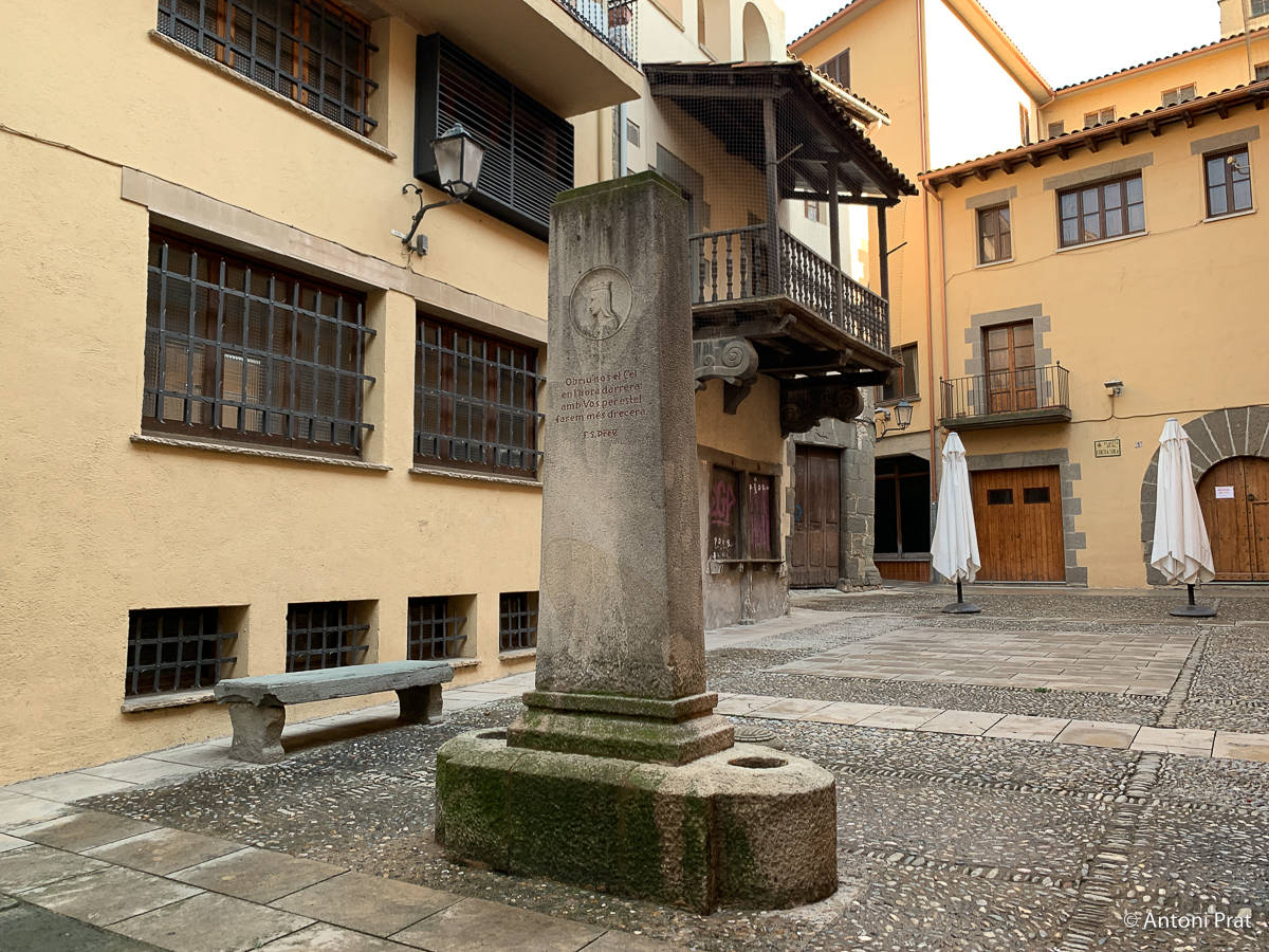 Crida l’atenció, i t’adones quan mires imatges antigues en blanc i negre com la del final d’aquest post, que al monument s’hi han fet una sèrie de modificacions en relació a l’original. Primer de tot s’ha modificat la seva ubicació doncs inicialment es trobava al mig de la placeta i ara no. També s’ha eliminat el voltant protector que tenia el piló mig rodó amb l’escut de Torelló quedant aquest isolat i clavat al terra. També s’ha girat la orientació original del monument doncs la cara que inicialment donava a l’entrada de la rectoria, ara mira cap al carrer Baixada de l’Arxiu. Vaja, tot plegat un nyap.